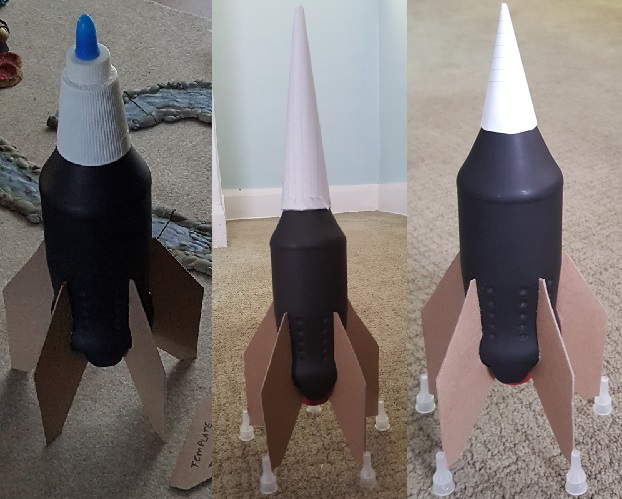 I decided on the last one shown… the shorter simple cone. The over all rocket is much shorter (squatter) than the reference image but it is plenty big when compared to the minis and will look impressive enough on the table top. If a taller rocket is desired, adding a cardboard tube (like from paper towels or wrapping paper) to the top of bottle would give the similar profile as in the reference photo. I may make a second version like that later on.