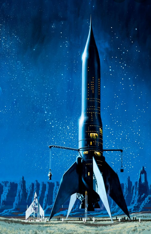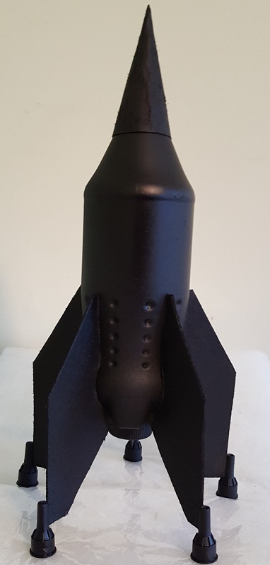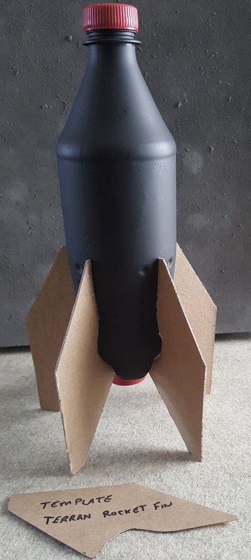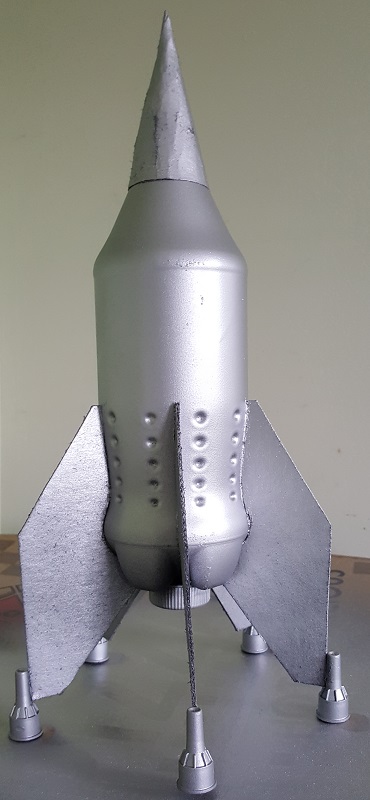 While trying to decide how the Terrans would reach the stars in pulp/retro fashion, I fell back on the old stand-by method of quick research: Google image search. From that quick survey, it seems that the vast majority of humans travel by missile shaped rockets that land upright standing one the fins. I found an image I liked as inspiration (it was on Pinterest without a photo credit… if you know when it is from, please comment) and I went to work looking at scrap plastic containers for items that could be recycled into a ship. I liked that this drink bottle was symmetrical all around. After removing the label residue with Goo Gone, the bottle washed with grease cutting dish soap, dried, then primed black. When deciding on the number of fins, I was leaning toward 3 or maybe 4. Then I noticed that my bottle had 10 row of dots so 5 fins spaced out between every 2 rows made for a nice balance. I made a fin template from some cereal box cardboard, then cut out the individual fins from heavier grafix medium chipboard. It is readily available from Amazon or from the back of most legal pads. The fins were attached to the bottle with Shoe Goo but E6000 or similar would work fine too. Shoe Goo is very thick and has a high tack level so the fins stayed in place almost immediately. I then started experimenting with various nose cones.