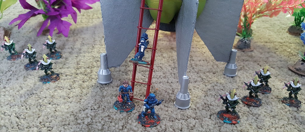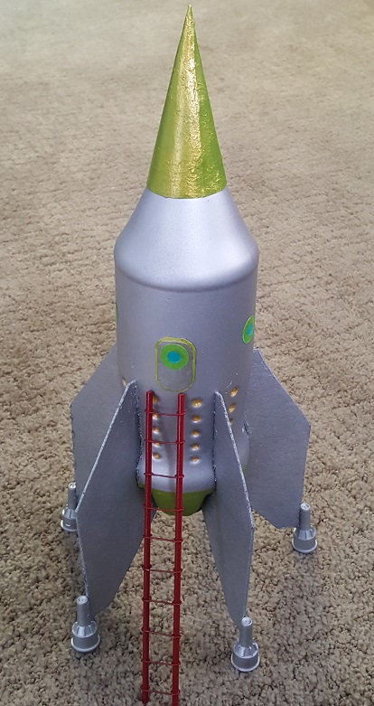 Then it was time to decide on paint scheme (I did prime the entire thing black first). I choose silver since that was the most common color in the images I found. I let my wife pick the accent color and she when with a metallic green. I made up a quick ladder, painted it red. I added some round portal windows made from those hole punch reinforcement stickers and painted the “glass” part with a metallic aqua. Lastly posed a it with some minis for scale (see top of post) and an overall finished shot. Add some more bits and pieces to suit your taste. Pen caps, container lids, etc. are all interesting shapes to include. I’m keeping mine pretty simple. Now the Terrans can go visit all the distant planets they wish.