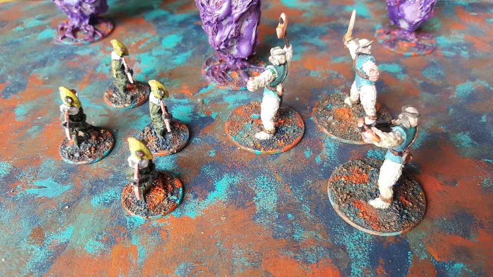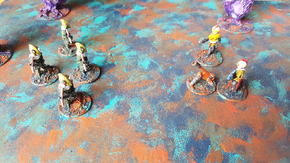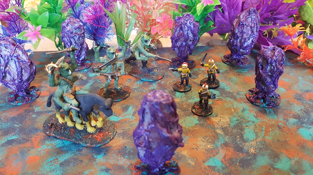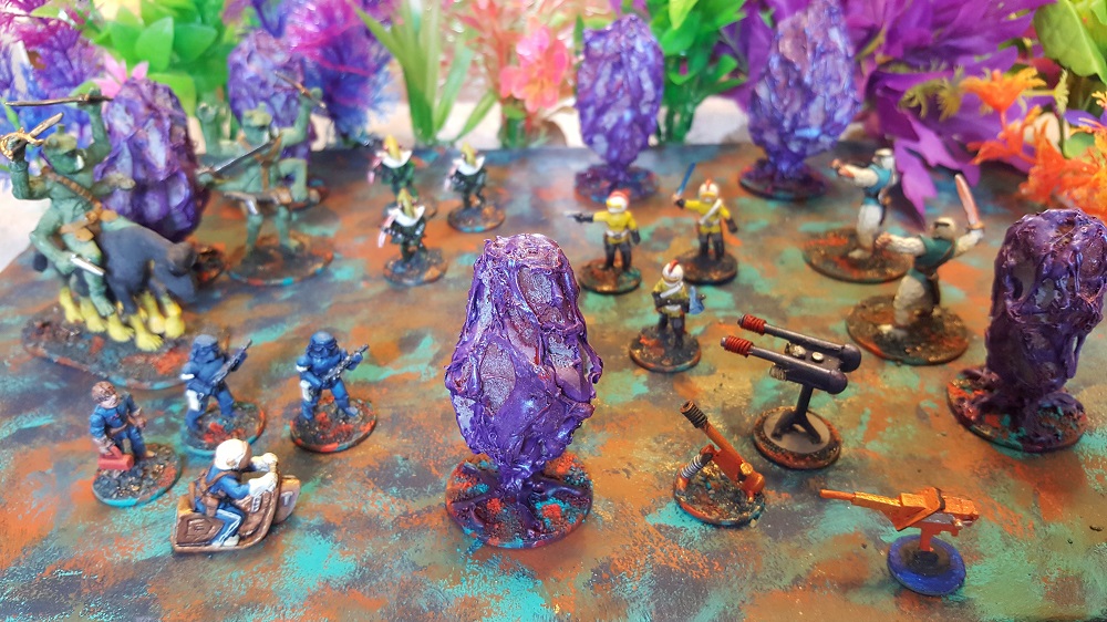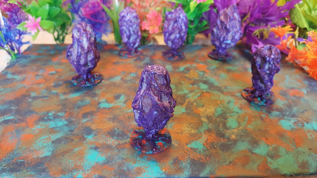 “What the heck are those weird pod things… they are giving me the creeps!” Yes, that is what they are. Just something to add a weird alien feel to your battle scape. Or, depending on your game rules, they can be a kind of hidden ambush encounter location or an objective marker for a particular scenario. These were also inspired by Scotty from TheDMsCraft. The particular YouTube video “What the @#$% is it?” can be found here. It is a super quick video, about a minute long. Not any dialog telling you how to do it in step-by-step fashion, or even what colors to use. It is super simple. So simple that after watching it, I thought I could do it, so of course I set out overconfidently and messed it up. Well, messed it up is likely too strong. My pods were made slightly differently but I still love them. I missed that he used packaging Styrofoam tube shapes. I used half a cotton ball stretched out some for each one instead. Because of that, mine vary in size/shape a bit more which I like. However, they were a pain to cover with the hot glue so I cannot recommend my construction method. The extra rigidity of the Styrofoam makes for a much easier build. Speaking of which, this is very quick and easy. Once your martials and tools are gathered (which is not much), these 6 were made in about a half hour just using scraps from around the house. I think they add a lot to my alien planet (with fish tank plants in the background).