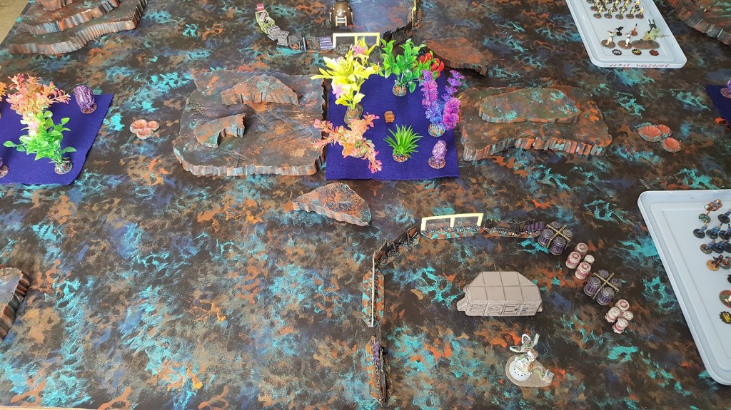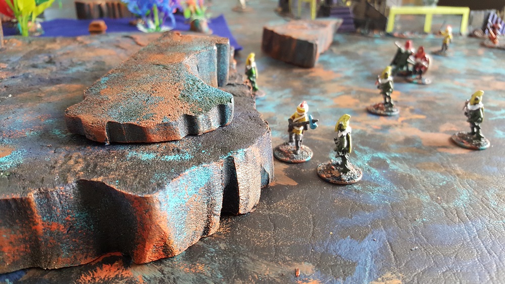 The morning of the game, as I was setting up the battlefield, I realized to my dismay that although I was successful at hastily constructing, hastily constructed barricades… I had totally neglected to craft pieces to define the woods boundaries. In the photos you will notice my “felt pieces of shame” that are fine for the purpose though lacking in any ascetics to be proud of. I’ll be building proper pieces to replace the felt soon for sure. Defining the woods boundaries with flat-ish pieces of anything that the models can stand on is helpful. This allows you to move the individual plant models out of the way as needed for the troops to move through, measure distances, etc. If this base pieces resembles plant roots and smaller undergrowth, all the better. Watch for a future post with that craft project.