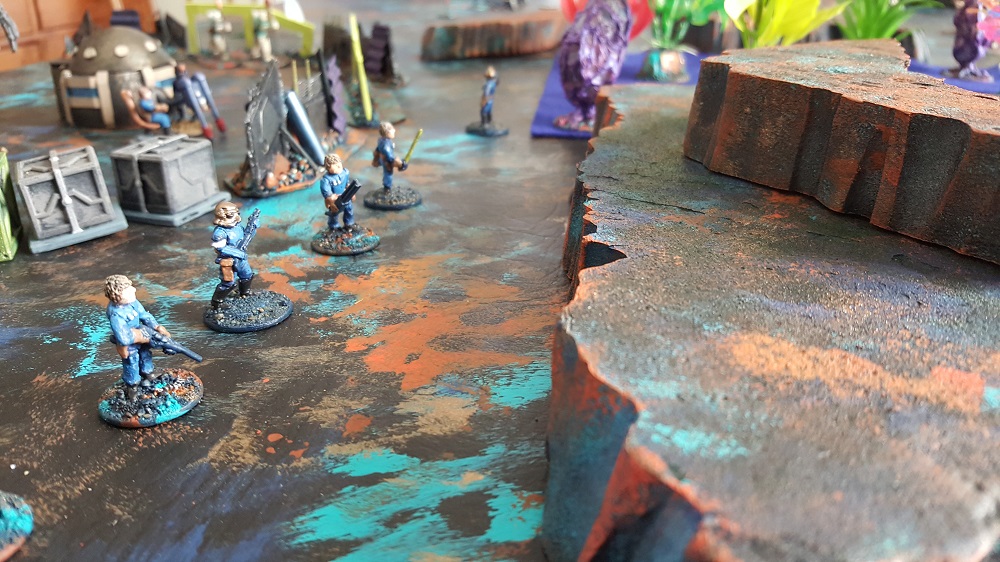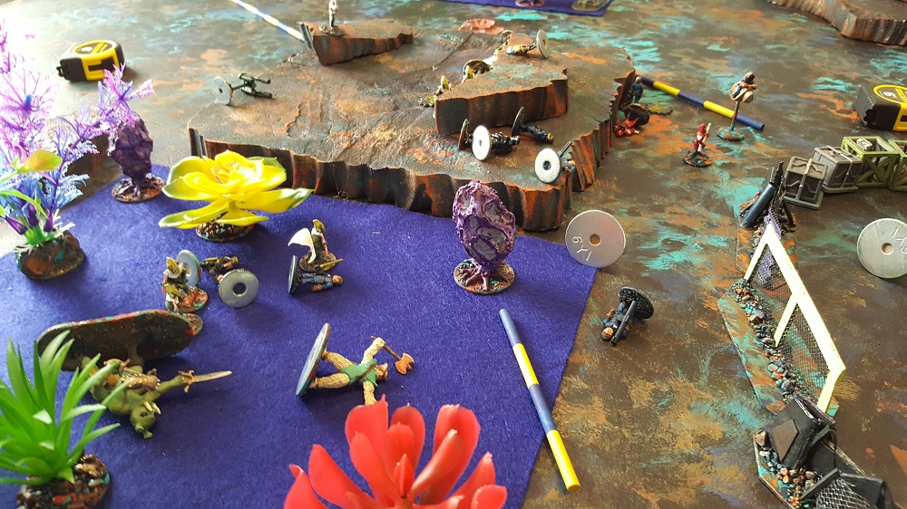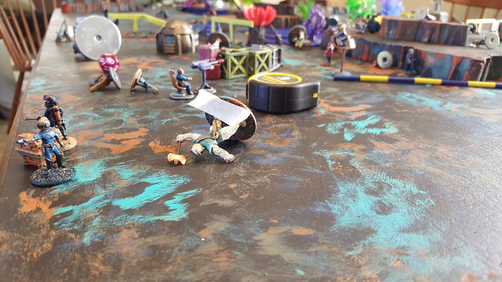The action on the east side of the battlefield was quick and deadly for both sides. The Death Raiders took out 3 Legionnaires in one shot with a lucky mortar hit. The Legionnaires retaliated by first shooting the Raiders’ Combat Flyer down. That Flyer Pilot was the recon troop that called in the mortar round. The pilot survived the crash and called in another round which took out the Sitan Giant brute and caused the Sitan Apes to run for cover. The Death Raiders’ early lead was very disheartening to the Legionnaires but they soon rallied. The remaining Legionnaires put an end to the Raider spotter but a huge toll was already taken. A successful flank action on the east end of the battlefield was not able to develop for either side.