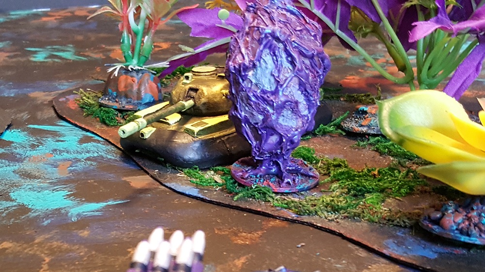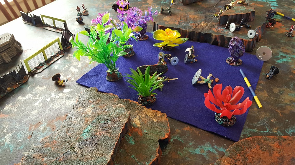 In the recent AAR post for the Fictioneers Scenario 1 Play-test, I bemoaned my felt pieces of shame on the tabletop to make the woods areas and I promised something better would be coming so here it is. It is a simple craft project that adds a lot to the look of your battlefield terrain. And although mine is a very colorful alien planet, the same idea can be done in greens and browns for a standard Earth landscape.