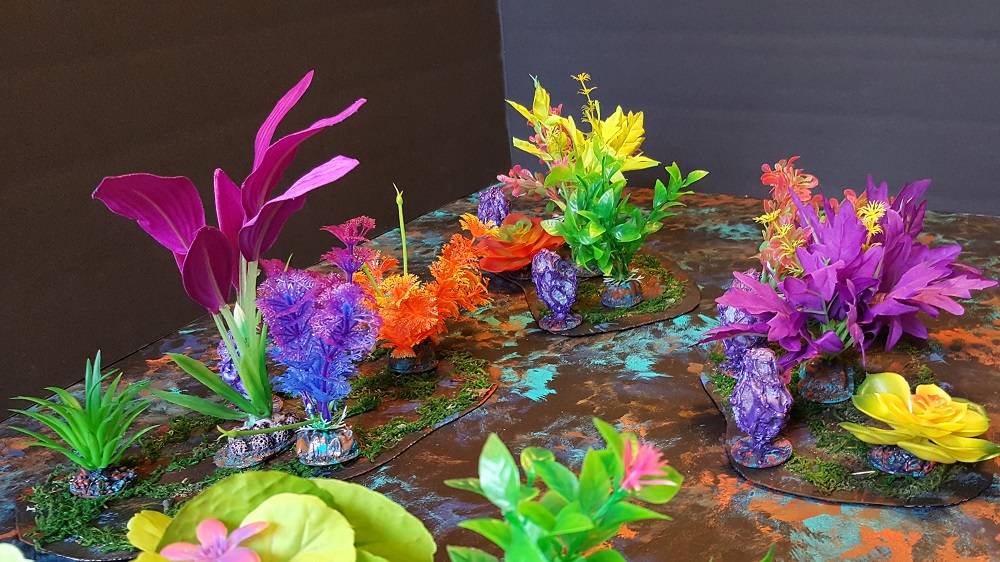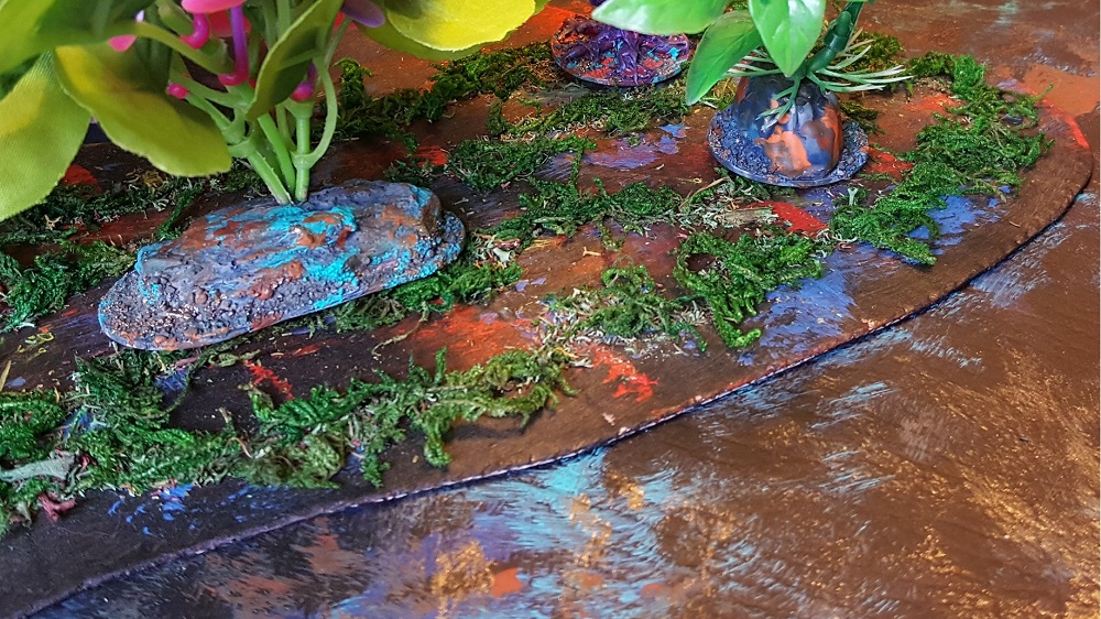Once that base coat was done, I dabbed some various paint colors onto the cardboard with a large brush. I picked blue, red, and yellow to go with my alien plant leaves but you can pick whatever color goes with your plants. I left a lot of the black showing so this would look a like a shadowy area under the trees/plants. I had some leftover flocking of different types from other projects, including some old spices (oregano if I recall correctly) which I mixed into a weird jumbly mix. Then I ran a couple quick oval tracks of PVA glue and covered it with the flocking mix. Leave large amounts of the painted surface to show. The idea is this adds some texture interest and looks like roots or undergrowth, but does not cause the models of miniature to fall over. I still need to go back and touch of the edges to hide the corrugation of the cardboard. They look fine in person but photographs magnify and light everything so well that it looks bad. Some modeling paste to plug the holes and and swipe of black paint will fix them. If you have access to grafix medium chipboard, or don’t mind spending money on buying it, you will be saved this extra step. I was just wanting to make all these from scraps found around the house.