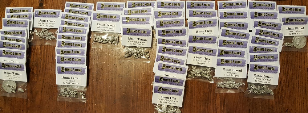 This next photo shows the 15mm Star Armor collection. Some items have not shipped to us yet so there are limited quantities. We’ll get those added to the inventory as soon as they arrive. The two hover platforms and all the Blarads however, need a new mold to be made. I have the masters from Stan but once this existing stock that I received from him sells out, they will be out of stock on our site for a substantial time until new molds are made. If you are interested in any of them, it is best to get your order in sooner rather than later. I know, the store isn’t even open yet, but if you can’t wait, you can let me know what you are interested in via our Contact form. We could then work out the details via email.