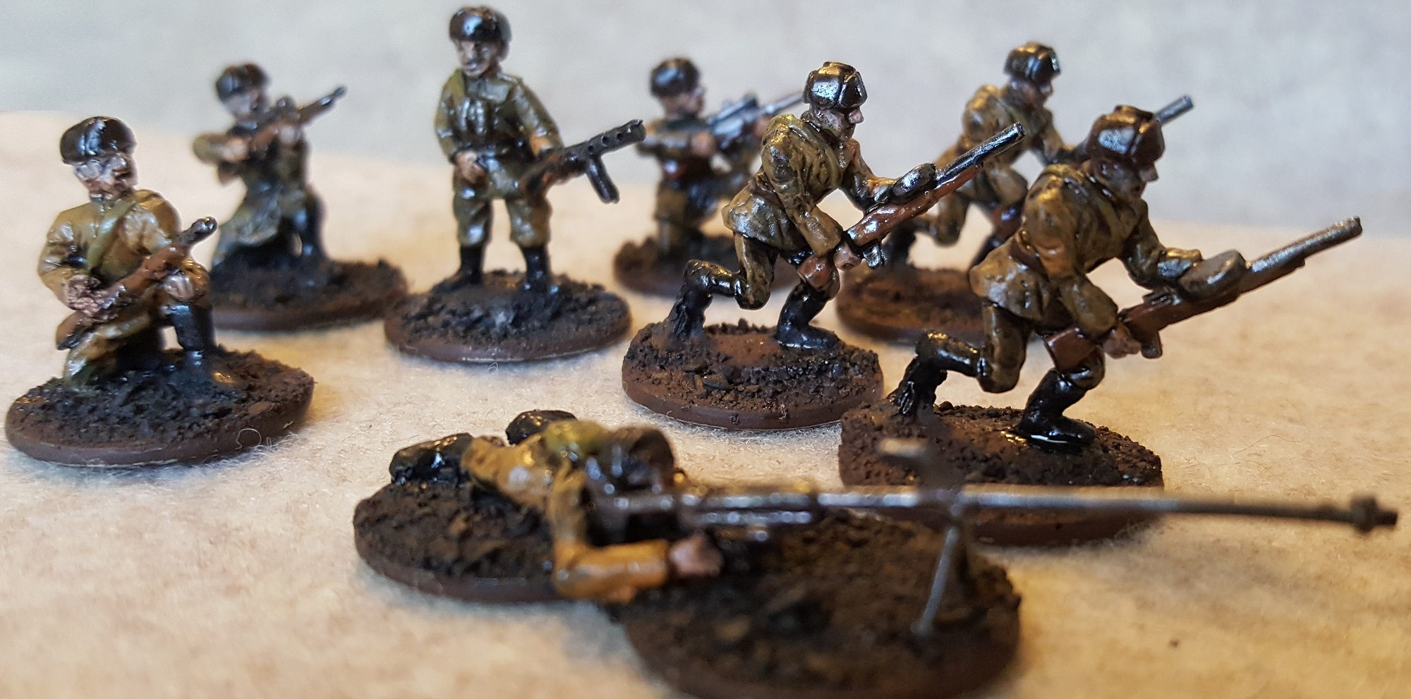 Below is a WIP photo of some of the 1/72 scale WWII Infantry (Russian & German) along with an Italian S-37 Armored Car from Reviresco that we’ll be carrying. I only have finished the base coat colors and the black wash. I still need to go back and dry-brush the highlight colors, then finish the bases, and lastly seal them with clear dull-coat. I was in a rush to take the photos this morning and the light was not ideal so the color might look a bit off. These are just a few spares that I had available. I wanted to get some painted up to start playtesting with. There are additional poses such as Russians with hard helmets and also troopers in winter outfits, the ones that look like Ralphie in A Christmas Story (“I can’t put my arms down!”). I still have a lot to learn about the fighting on the Eastern Front before I place an order for the mold such as what is a good ratio for the Russian’s weapon mix: Rifles — Rifles w/Scopes — SMG — MG?