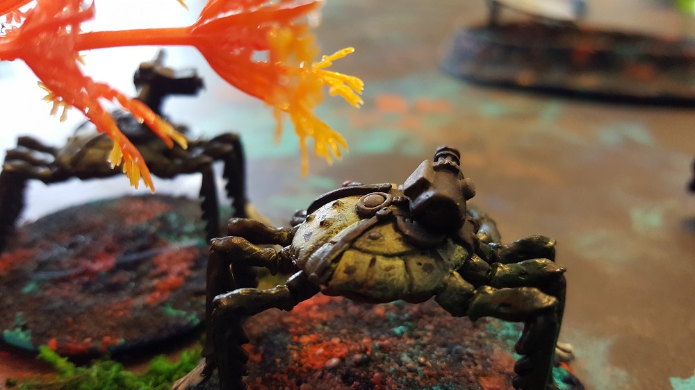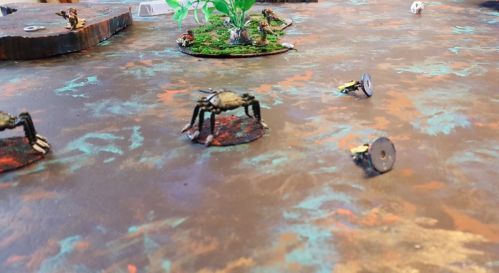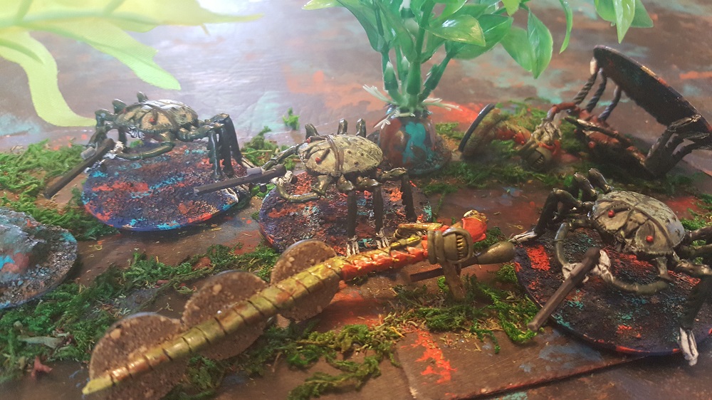 The “behind the curtain” reason for making races more powerful based on their larger size is a bit mundane. Sure it makes sense that a larger person/creature would be stronger but it really comes down to cost. The biggest cost component of a miniature is the amount of metal. If the strengths of the Ssss and Terrans were the same, a player would need to buy the same number of figures but the Ssss player would have to pay 3 times the cost due to the larger figures. With our rules, the Ssss are 3 times as as powerful, so the player only needs 1/3 the figures and the units cost the Ssss player the same as the Terran player. I hope I explained that well enough. The squad packs listed on our webstore will are based on this system. The Ssss are packaged 3 to a pack. The Klackon, which are equivalent to 5 Terrans, are packaged 2 to a pack. Terrans when they are available, will be packaged 8-10 to a pack. That’s likely all more math than folks care about. The short answer is that the per squad price should be nearly the same no mater which faction you choose to play. We felt that was an important concept from the initial planning of the game balance. Pick the faction you like the looks of, or based on how many miniatures you like to have in a you unit. The overall cost for an army will not vary much from faction to faction. Multiple squads for both the 25mm Klackon and Ssss figures that we used in this playtest session are currently available on our online shop here.