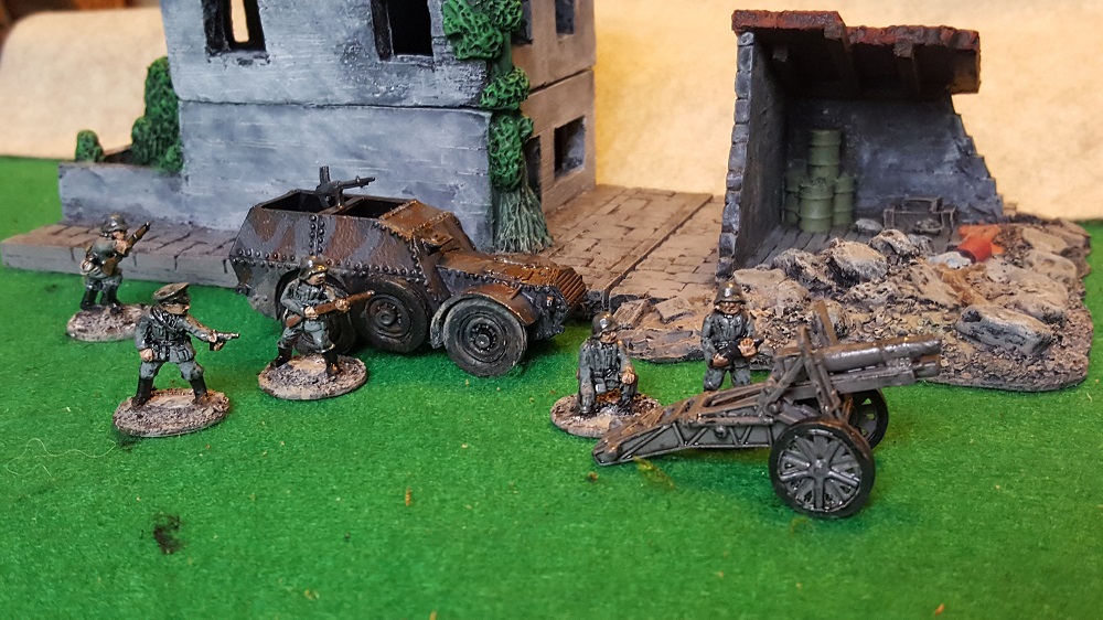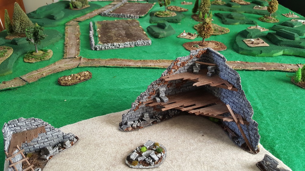I setup a generic scene with terrain pieces that happened to be laying around close by. I just wanted some rough going areas and obstacles to block line of sight, to disrupt movement, and provide some cover. Some hills, woods, muddy road, and ruined building did the trick. It gave us plenty to work around/over. Most of our fighting was in and around the ruins which was designated as a impromptu fuel depot (i.e. something to fight for).