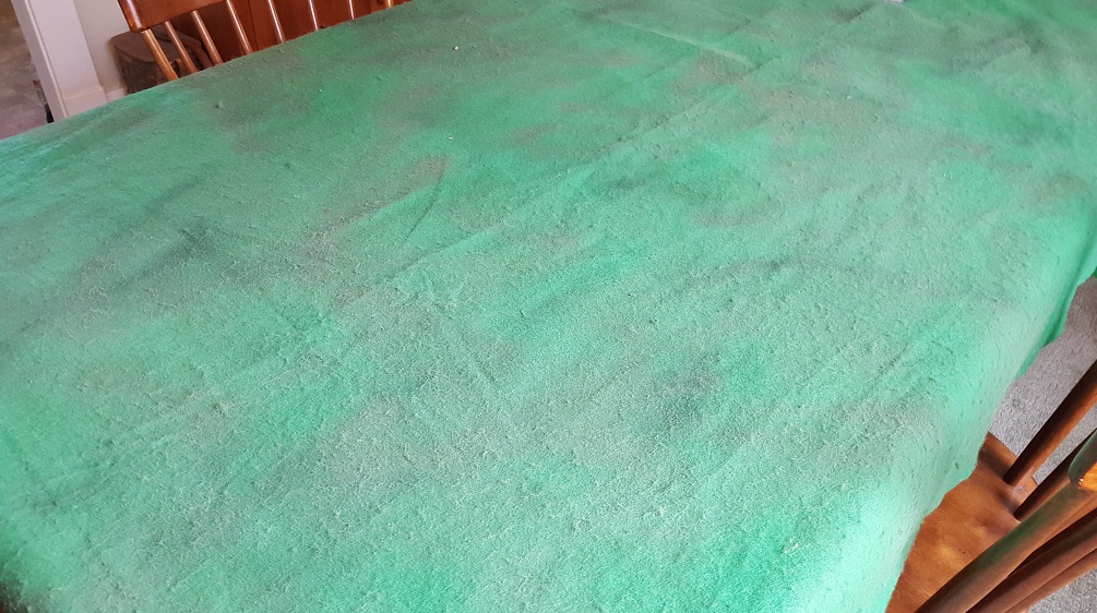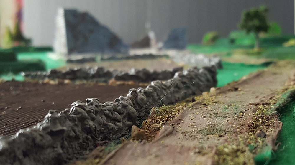 I’m always looking to improve my setup but still keep it budget friendly. There a lot of great battle mats and game board systems out there but if you are just getting started, try this simple idea. It is cheap, quick, and easy to make. Also has the benefits of being light weight, easily transportable, and packs up small for when it is time to put it away. I started with some felt, large enough to cover my table. For historical battles, I have used a bright green color that I never was really happy with the look of. After this playtest session, I took the material outside and then lightly spray it with swirly spots with black/brown/green to create a mottled effect. Even though it obviously needs ironed in this photo, it looks much better that the solid green that it was. The hills that I made are from scrap foam which was easy to paint. I’ll be touching them up soon to match the new paint scheme on the ground cloth. Roads and rivers are a work in progress. They are easy to make from scrap fabric covered with paintable caulking. Trees can be scratch build but I find that to be an area better to buy kits or finished pieces from the model train folks. My trees come from many different sources dating back to the 1970s so it is quite varied. We’ll post some tutorials in the future to help get you going but in the meantime, links to some of our favorite video tutorials and products are found here. The house and shed are just some samples that I painted up. I’m considering carrying them in the shop.