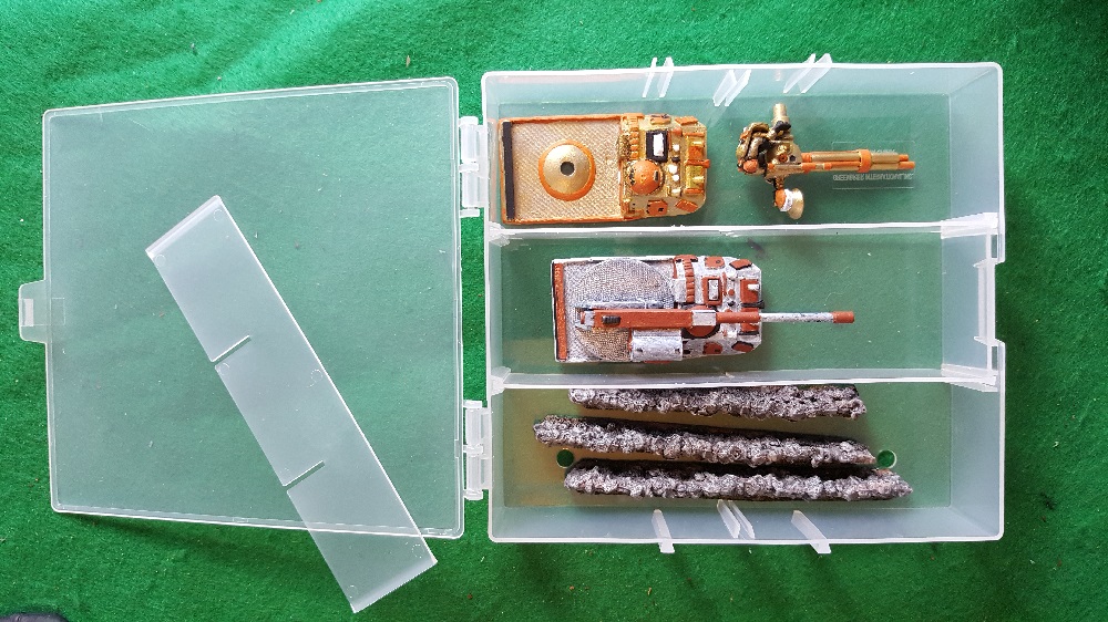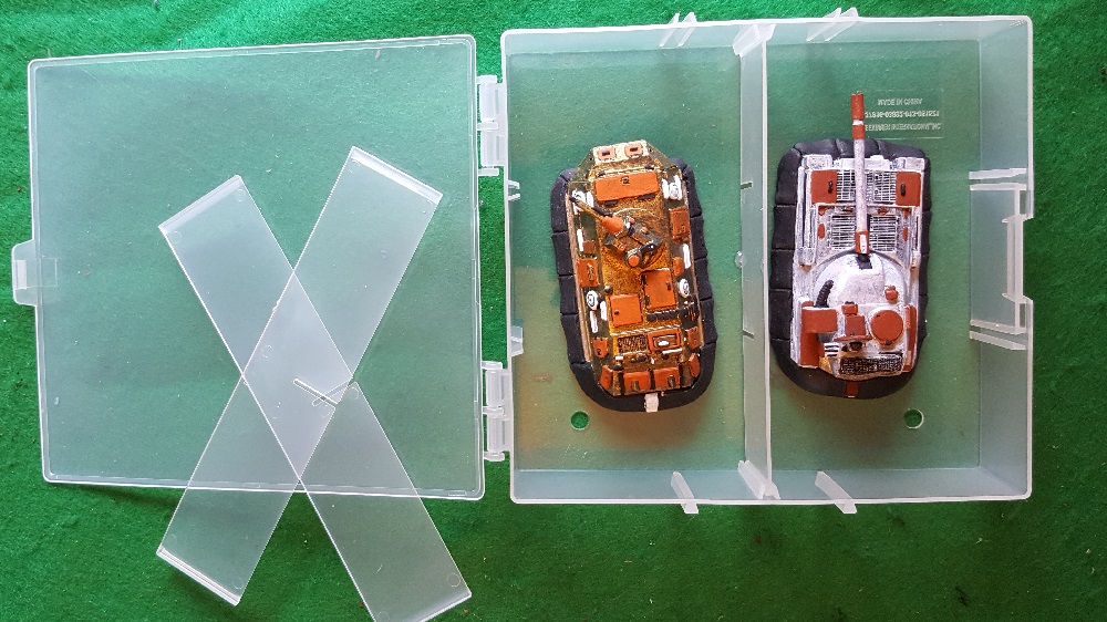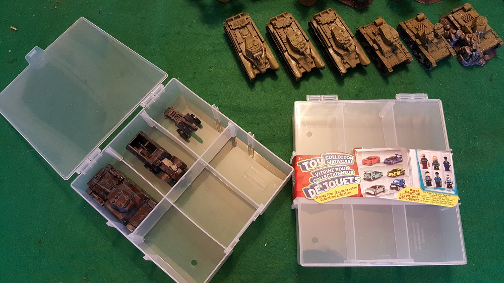Here is an extra free tip if you happen to live near a Dollar Tree store. They have these handy little storage totes that they mistakenly believe are for housing toys. They are perfect for holding tanks and other similar miniatures/models. The dividers do come out to allow for wider or longer items. I forget if they are $1.25 now or whatnot exactly but they are well worth the price. They are not overly huge but they likely will hold a particular faction or unit depending on your rules system. It makes for easy grab-and-go when you are heading to a convention or local game club meeting. The funny thing is, I don’t think they are all that great for their intended purpose. The plastic is clear-ish but far from the crystal clear that you’d want in a display case.