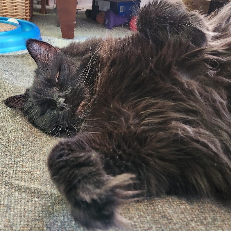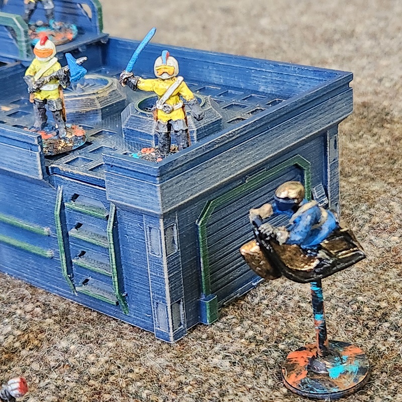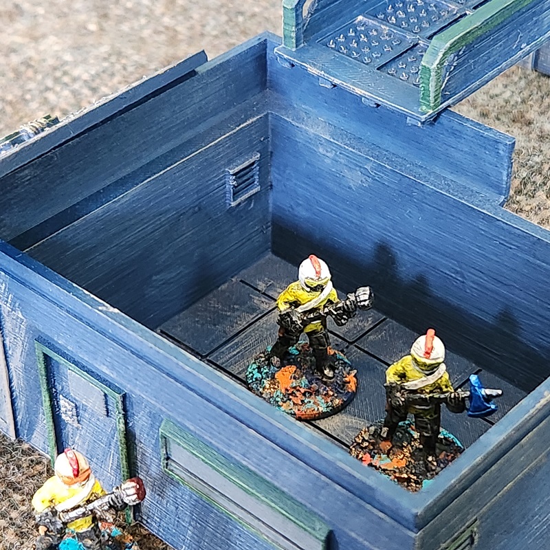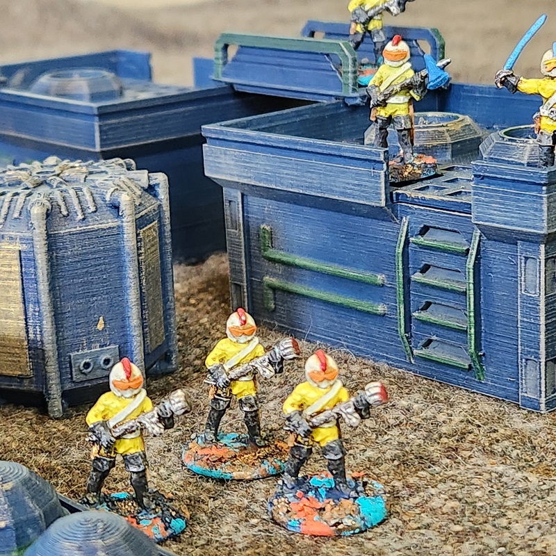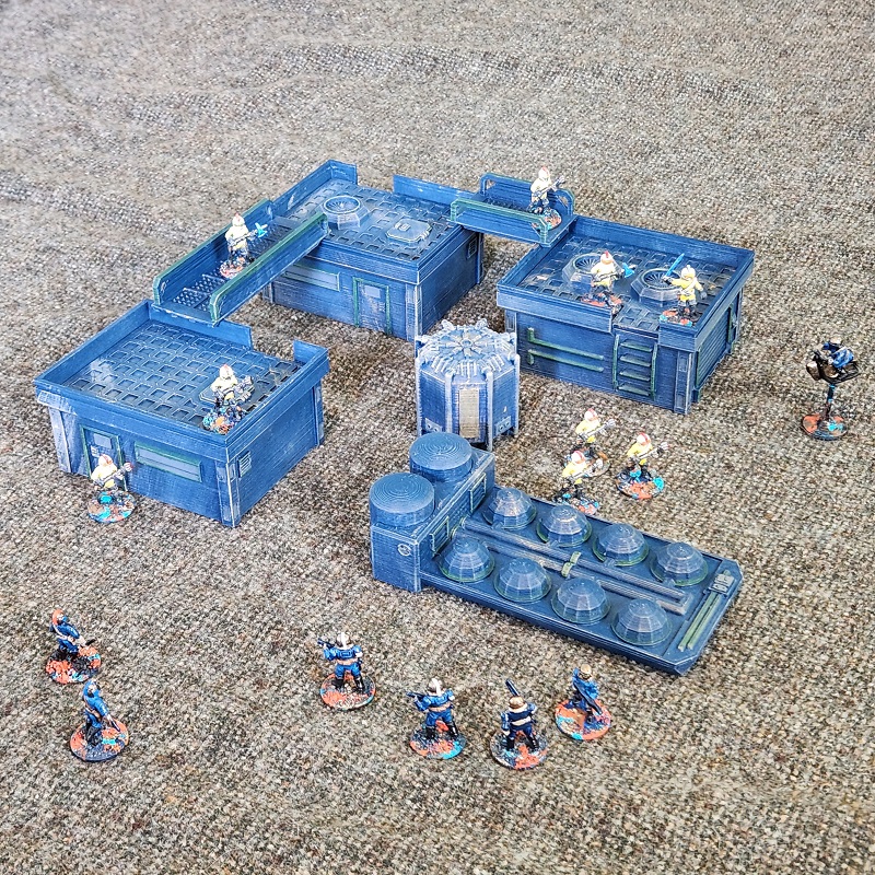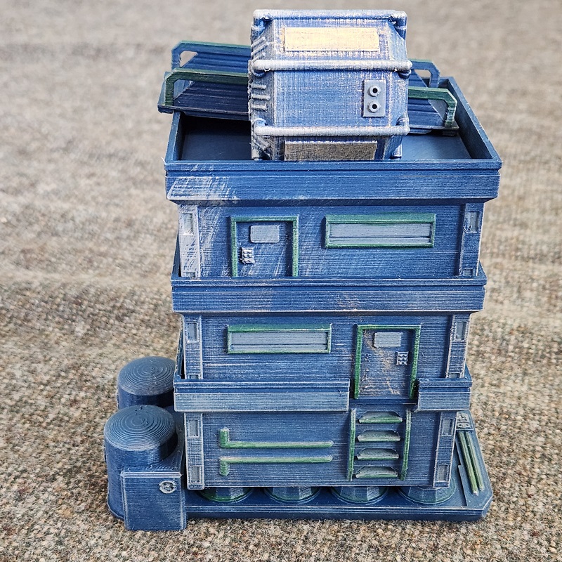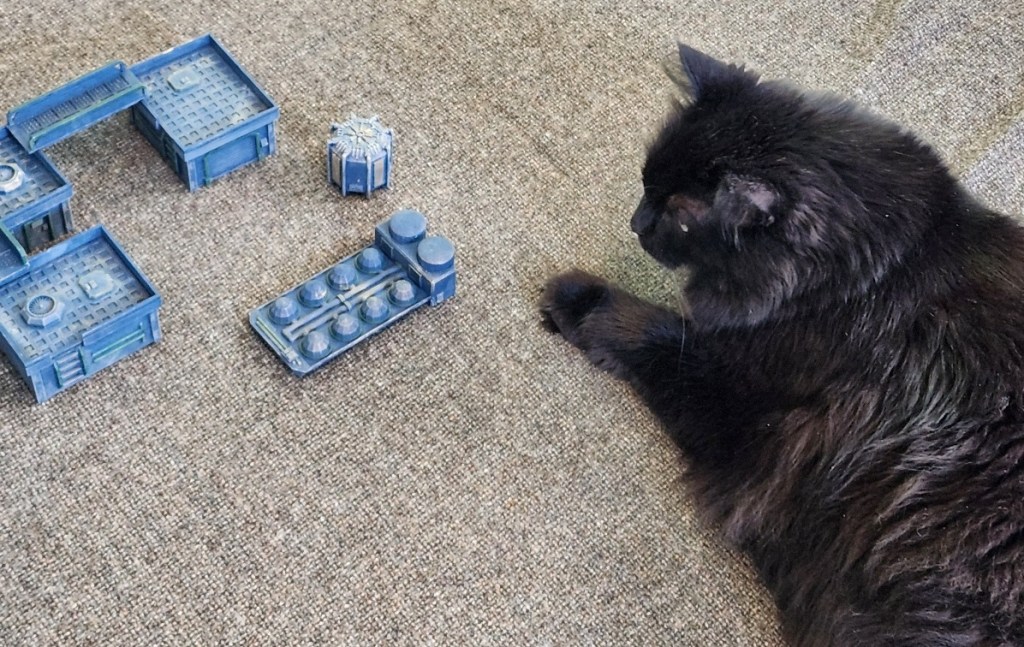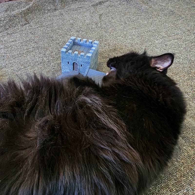 The last set to show today, is the Sci-Fi Settlement Set. These were painted by Gwen. I didn’t track her time but it seems like they went pretty quick. I don’t recall the material color these were printed in… possibly gray. She did a base coat of navy blue, then drybrushing green, gray, sand, and gold. The set contains 2 Hab-Units, 1 Garage-Unit, a Long & Short Walkway Section, a Hydroponic Farm (Algae Bed), and a Liquid Gas Chiller. The walkways just hook on the roof edges anywhere allowing for many different arrangements. The flat roofs and walkways add lots of playable height for your games. Again, the photo near the bottom shows these have removable roofs with detailed playable interiors for lots of use for wargaming or RPGs. And, even though they do not totally nest, they stack up into a small bundle. Well, as the last photo shows, the boss has fallen asleep on the job, so I’m going to sneak out early today.