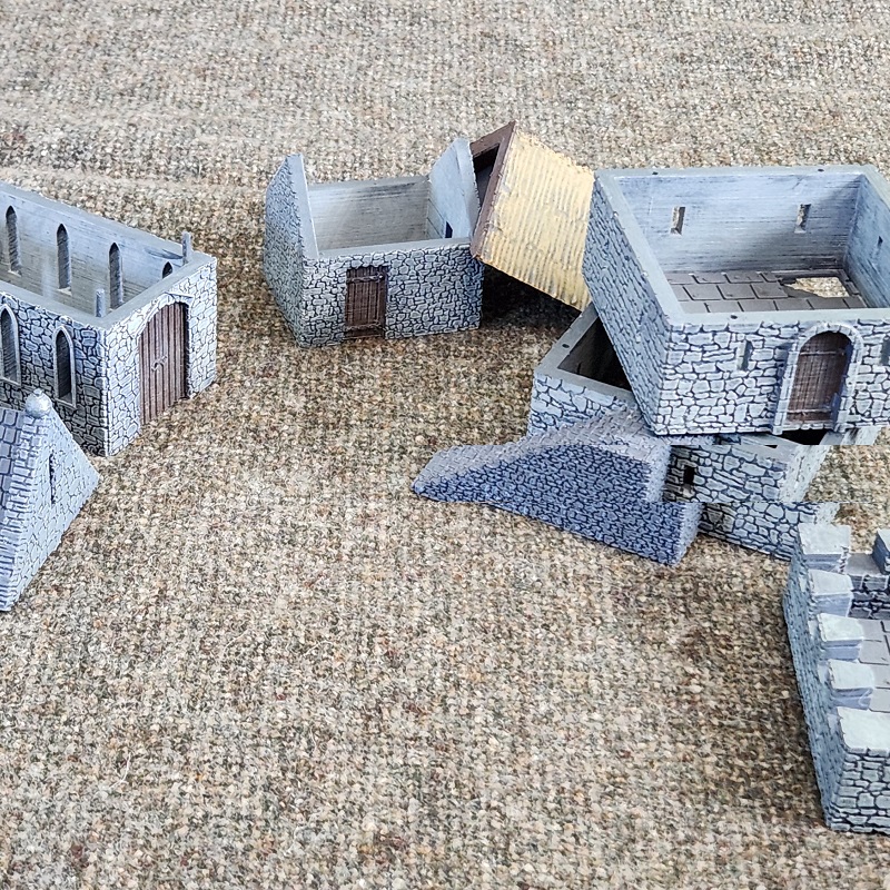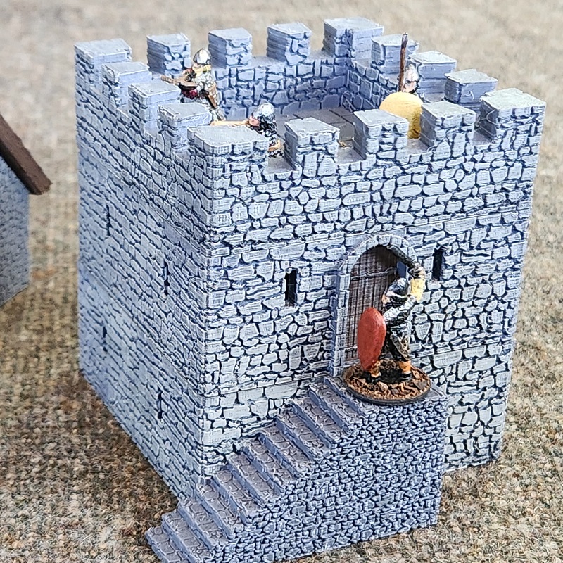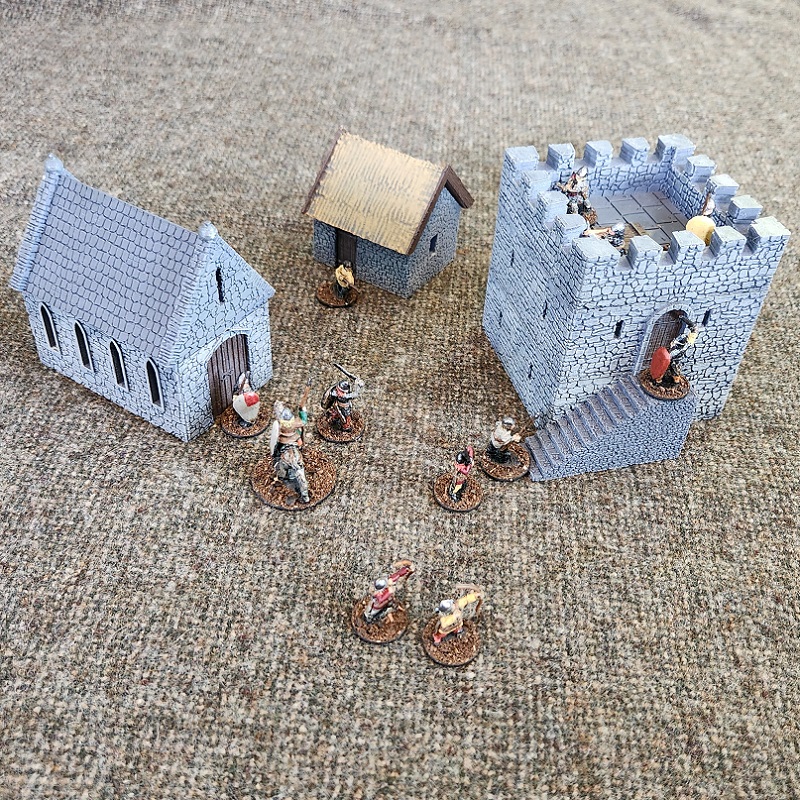 Next is the Norman Set. This contains a Lookout-Post, Stone Chapel, and Stone Shed. These were printed in a gray color material and again painted up very quickly. They took a bit longer because of painting the interior plastered walls was a little more the just a quick drybrushing. I’ll point out that in the first photo below, you’ll see that I fell victim to one of the classic blunders: I neglected to have the roof on the building while doing the final dry bushing so the tones do not match. Yikes… Wolf called me an amateur and hurt my feelings. The first couple photos show our Warlord figures which we already showed look great with the 20mm scale building above. I also included the 3rd photo with some really cool McEwan Miniatures (now Reviresco) fantasy figures to show this set can do double duty for historical and fantasy encounters, and that it looks great with the slightly taller True25s 1/72 scale figures. Then below that, you’ll notice the roofs and middle floor of the tiny keep are removeable to review playable interiors. Lastly, quality inspector Wolf does a strength test and determined that these buildings are in fact well-made and should last you a long time. (We do not recommend letting your own quality inspectors bite your models… ours is very insistent that this is the correct procedure and it must be done.)