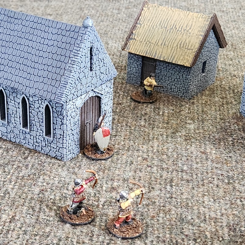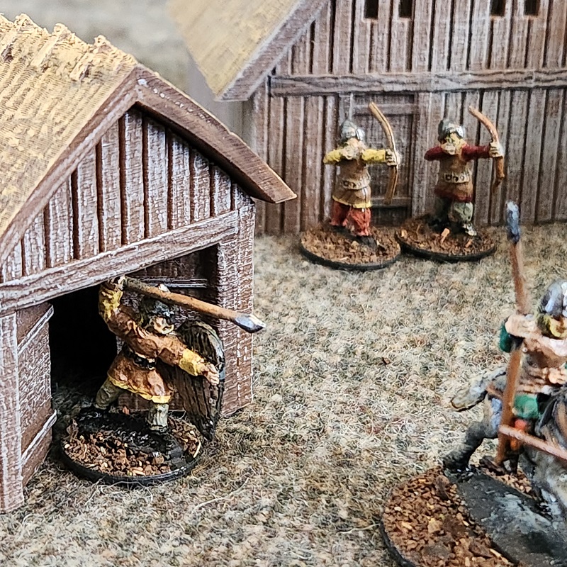 Below are some photos of my painted pieces for the Viking Set. I’m sure you can do better job… I’m colorblind so I just slap some colors on the pieces pretty quickly. These were printed in a brown? color material so no priming or base coating were needed. I did dry brushing only… some browns on the wood and yellows on the roof. Then a bit of RRB Minis secret gloss brown wash (I really need to get the washes listed on the webstore soon). Lastly, a clear matt spray. I would have used the flat brown wash but I don’t have any on hand at the moment. I think they came out very nice for around an hour of work. They basically painted themselves. The set contains a long house, house, and shed. A couple of notes: Our minis shown here for this entire post are not 20mm but rather are true25s (however, the Warlord Normans and Vikings are a bit smaller). Though that means they are really 1/72 scale tall, they do work perfectly well with 20mm terrain. The figure height difference is only 1-2mm (I’ll do a ranting blog post about scales, sizes, math, and human-proportions some other day). The buildings come with removable roofs and detailed interiors. This makes them perfect for hiding some extra surprise troops.