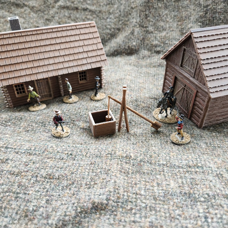 The next set is the Western/Frontier Ranch. It contains a house, barn and well. These were printed in a brown colored material. It still painted up super quick but still a bit longer. The cut ends of the logs and all the sawn wood piece (door and windows) were painted a different shade than the bark on the logs. The barn doors are supplied loose. I chose to attach them in the closed position. You could also attach them open obviously, or get fancy and make some small hinges. I just used some E6000 so I can easily change them in the future. The figures shown are McEwan Miniatures (now Reviresco) cowboy True25s 1/72 scale figures. The roofs and the barn’s upper floor are removable to show detailed playable interiors. The inside of the house in particular is very nicely done. Whatever scenario we come up with for this set is going to have some action happen inside the house for sure. What do you think? I has to be something more than just looting the place or a simple shootout. And the last photo of course… Wolf does not trust me to work unsupervised.