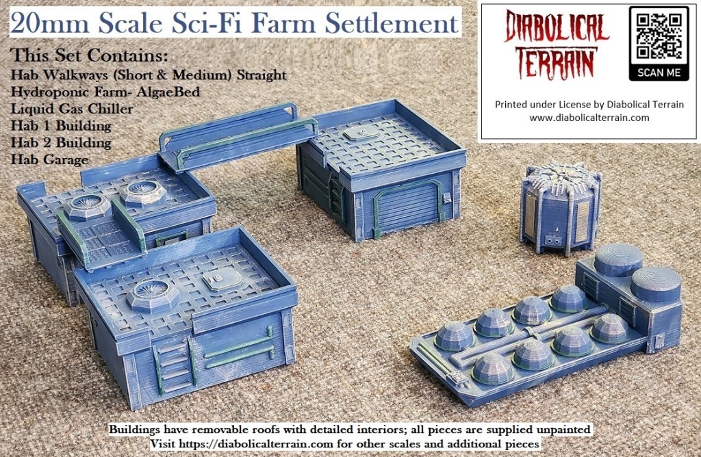 Just a quick wrap up. These sets are nicely detailed, sturdy, lightweight, and do not take up a ton of space (the boxes that contain them are 9″x7″x4″). As with all the items we choose to carry, we feel they are a good value and will provide a lot of use/reuse. The set will be provided unpainted for right around the $40 per set. The price is the same if you get them from us, or directly from Diabolical Terrain so if you don’t want to wait for us to get the boxed sets put together, or do not expect to see us soon, check out their online store. Below is the box label for the Sci-Fi Set. Let us know what you think.