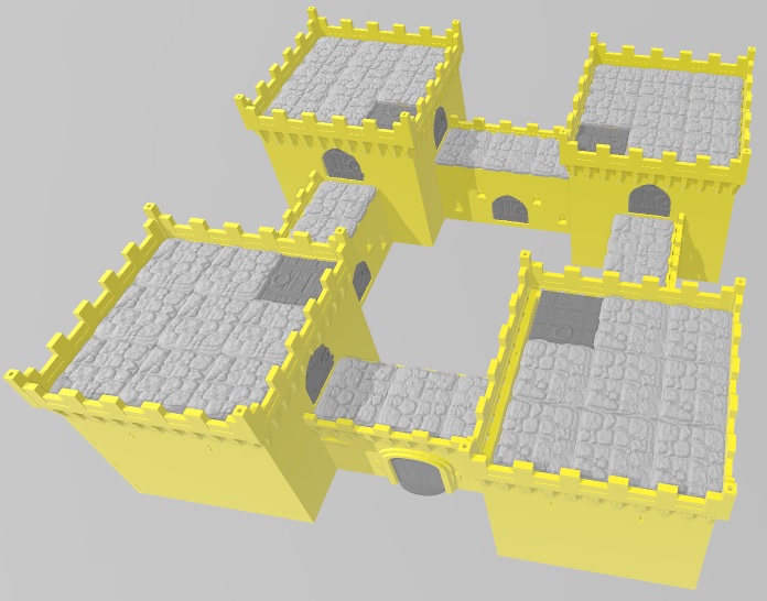 I need to do a few more tweaks to my models before I upload them to Thingiverse. Once I do, I’ll update this post with a link to them. There will be one for each of the terrain types listed in the rule including the complete castle. For those not familiar with Thingiverse, the models are all offered for free. Most include share & share alike licenses that allow uses to remix or modify the work and offer it up with the same agreement. It is a great way to help the community grow by lowering the bar of entry so that is what we decided to to here. You can get the rules for free so why shouldn’t you be able to get the 3d models of the needed terrain for free also. Test prints of castle pieces just started this morning so we only have a screen render at the moment.