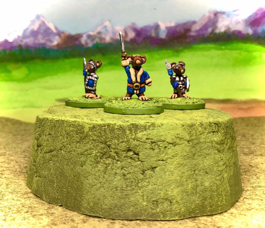 But this blog post is going to deal with terrain for them. While the terrain is suitable for a wide range of games the unique scale of the mice figures creates an opportunity to have some fun with one new piece in particular. By scale, I don’t mean the figure size. They are around the same size as most 15mm figures so there is a lot of terrain out there already for those. I really mean scale because, although they are anthropomorphic, they are still mouse-size. A lot of the terrain can simply be “re-sized” by the simple name change spelled out in the rules. Instead of having a lake be an obstacle for movement, the mice warriors must skirt around a pond. Or instead of climbing a tall hill to gain an advantage, they utilize a mound as the king and his body guard are doing below.