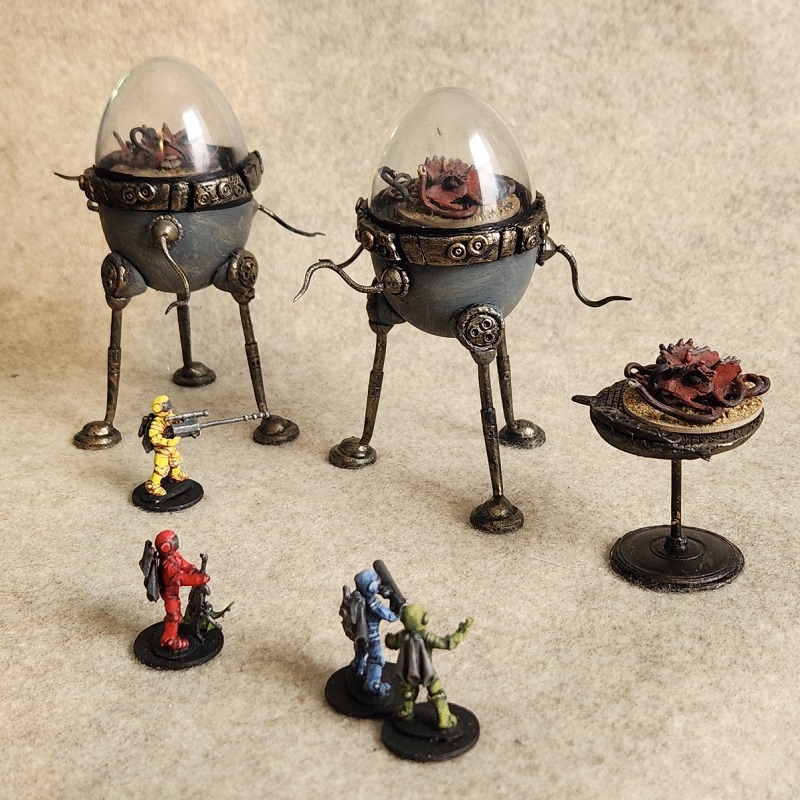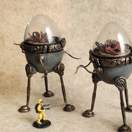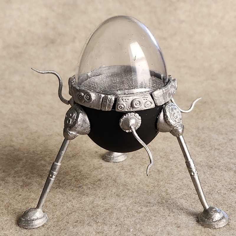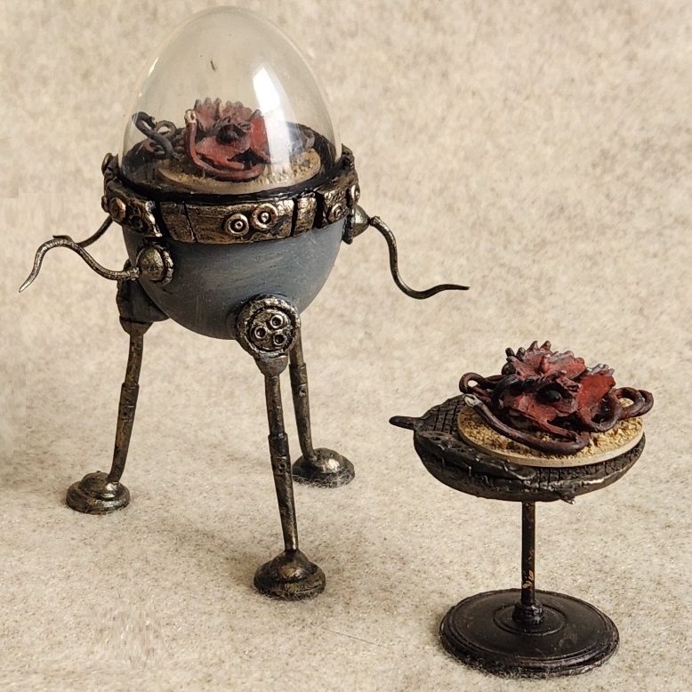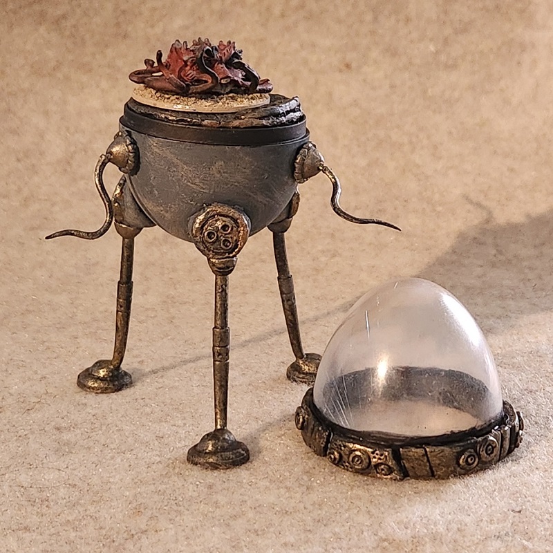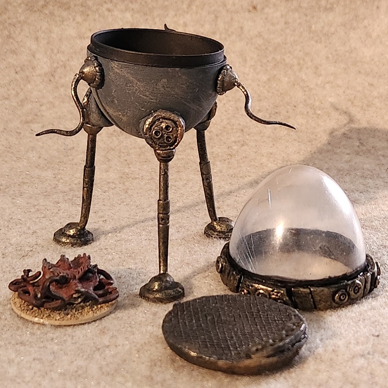 Below are the assembly steps for the Marsian walker sculpted by John McEwan (McEwan Miniatures or Reviresco), Stan Johansen, and RRB Minis. Note that I had the initial unpainted walker’s legs positioned too high at first. They are not indexed, so if you like the look of this better, go ahead and make yours that way.