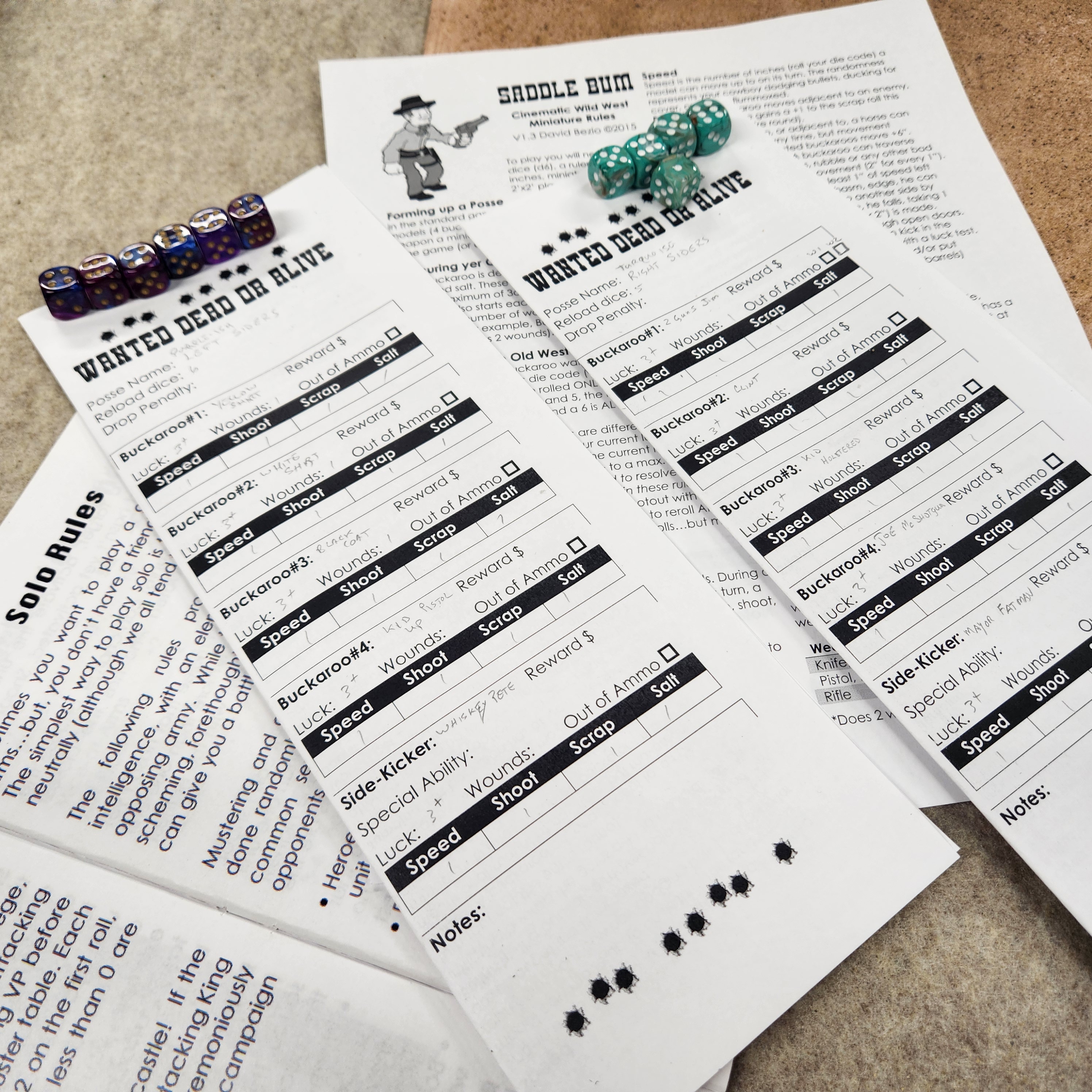 I finally had time to playtest David Bezio’s wild west game Saddle Bum. It has been around for a while, and was replaced by David’s Shooting Iron game, but the original Saddle Bum rules have been updated and re-released for its 10 year anniversary. It is currently being offered for free on Wargame Vault here along with several other of David’s games. Check them out!