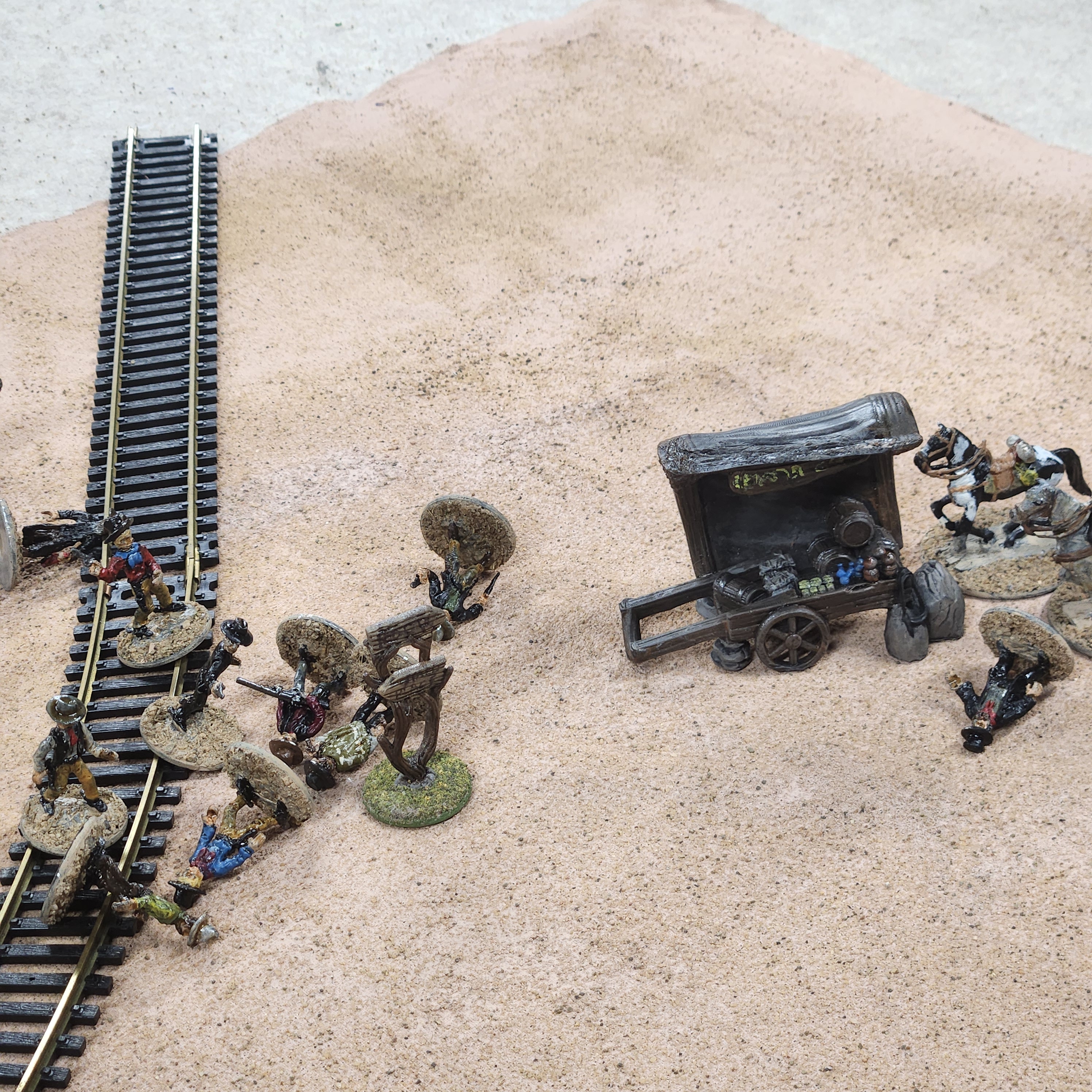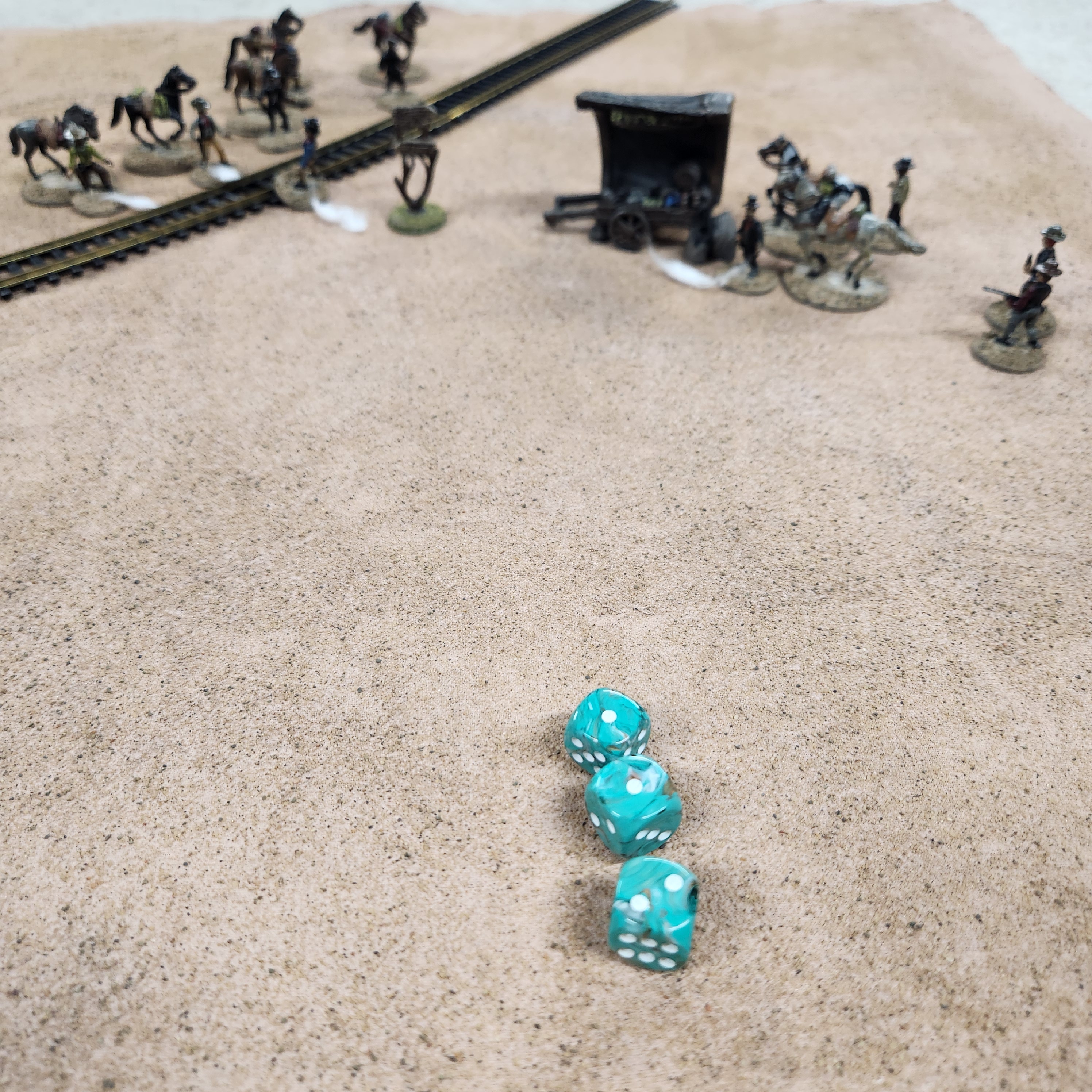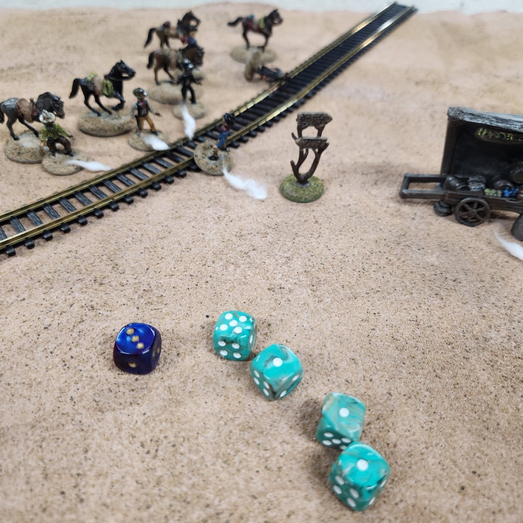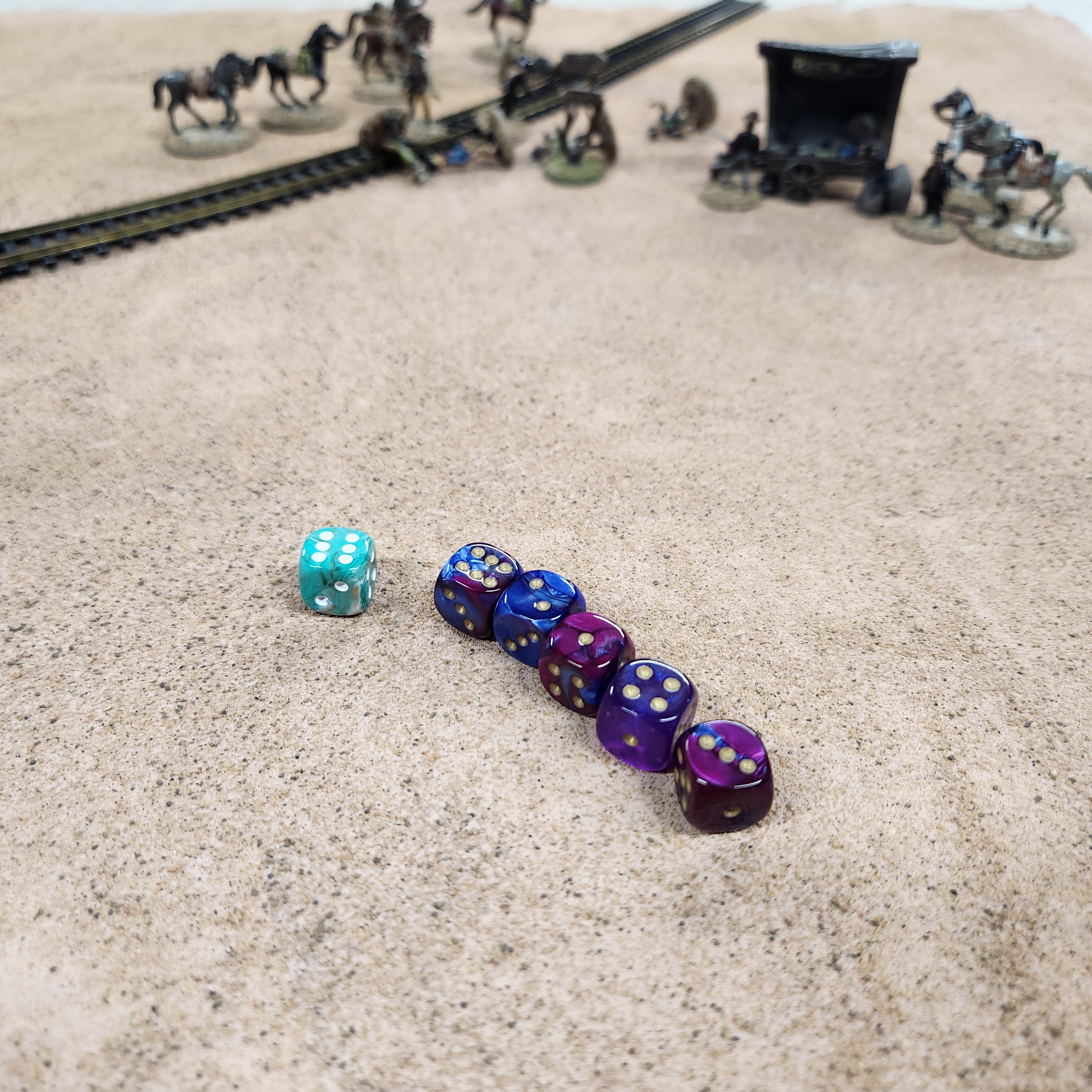Finding myself alone on a cold snowy Sat., I decided to give this game ago using the solo rules from David’s Mice-at-Arms rulebook. The setup was along the tracks on a stretch just outside of town. Two posses meet up… both considering the other to be from the wrong side of the tracks. We had the Purplish Left Siders vs the Turquoise Right Siders. The Purps had a Doc in their posse (Whiskey Pete) to help keep any wounds from turning too serious. The Turqs had the Mayor (a Boss) to help keep everyone motivated and things going efficiently. Both sides ended up with a lot of reload dice (6 to the Purps and 5 to the Turqs). The Turqs also had a guy with a shotgun which, though more deadly than a pistol, does slow the posse down a bit. There was little cover… some horses to hide behind and a traveling merchant’s wagon. (This was meant to be a shoot out after all. And I haven’t painted my buildings yet… I’d better get busy on that.) Things start off bad for the Turqs. A simple plan to shoot at an enemy burns through 2 reload dice and then the shot still misses. Burn more dice to try for a hit?… no, not being unloaded is good enough for now. It is early in the game.