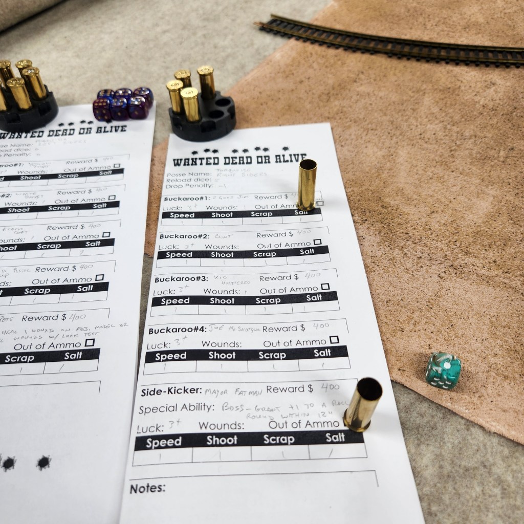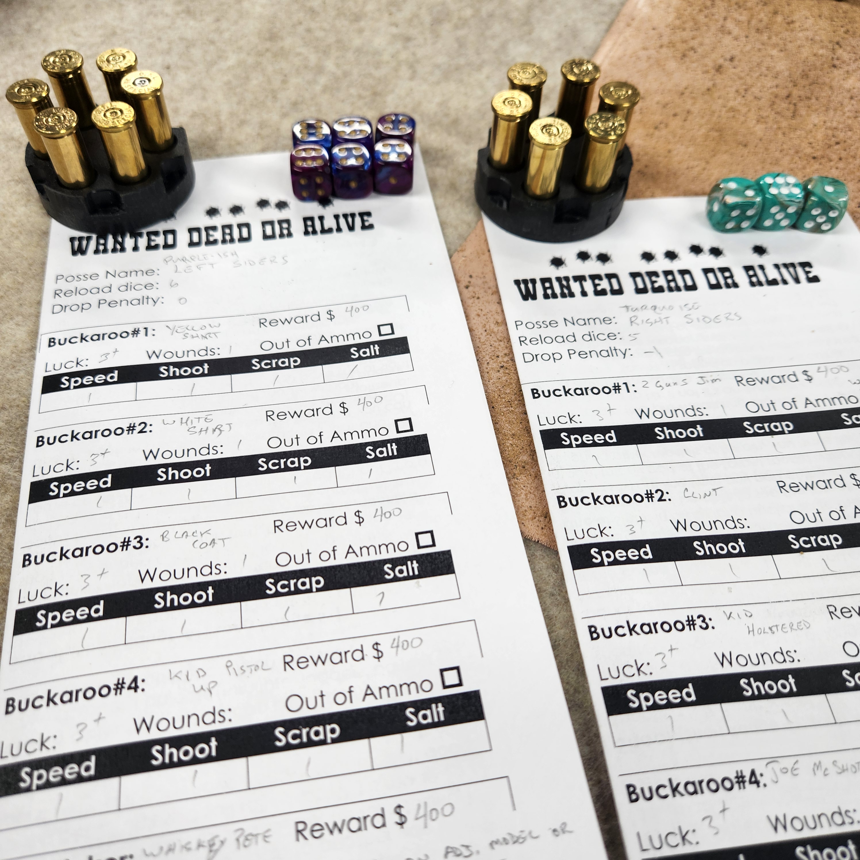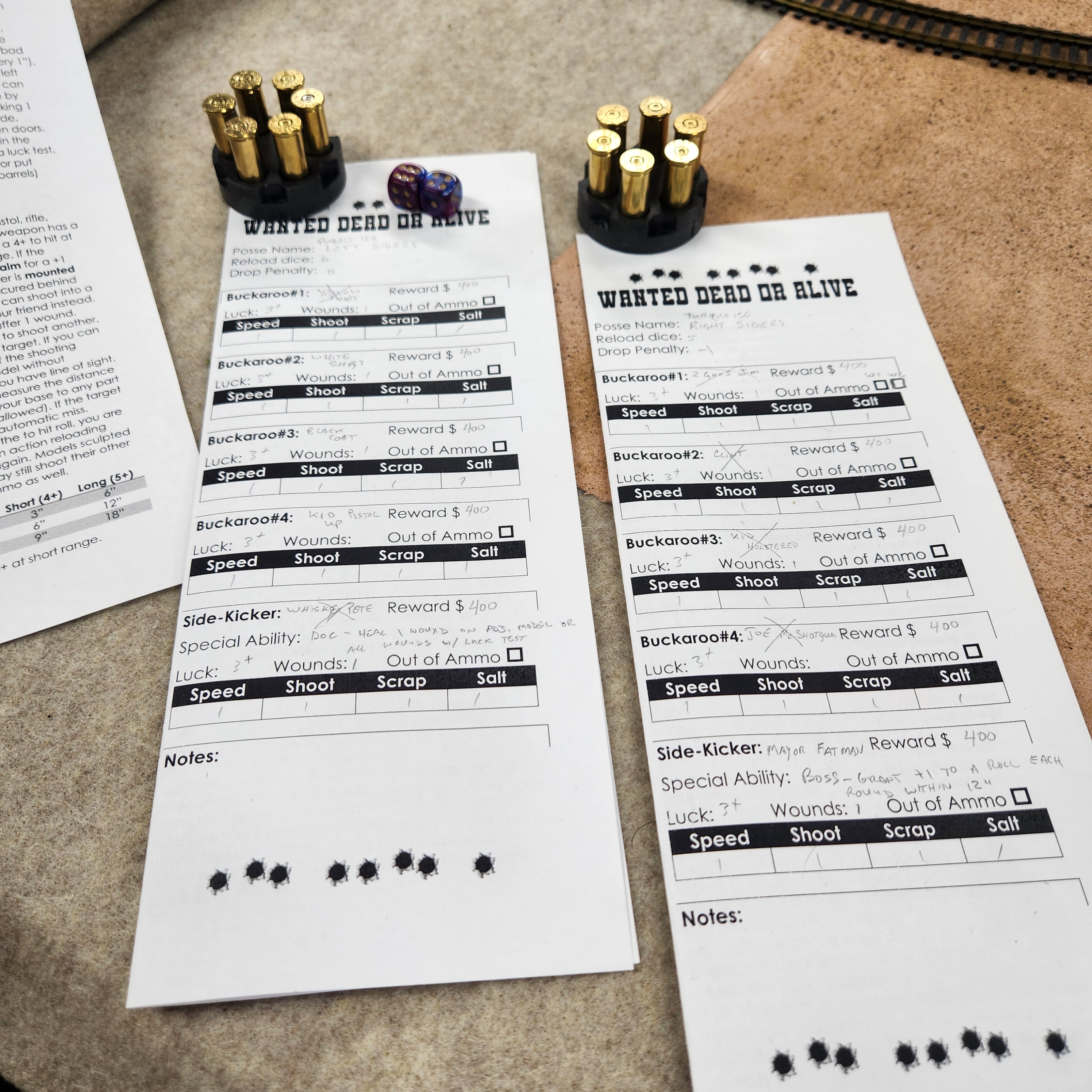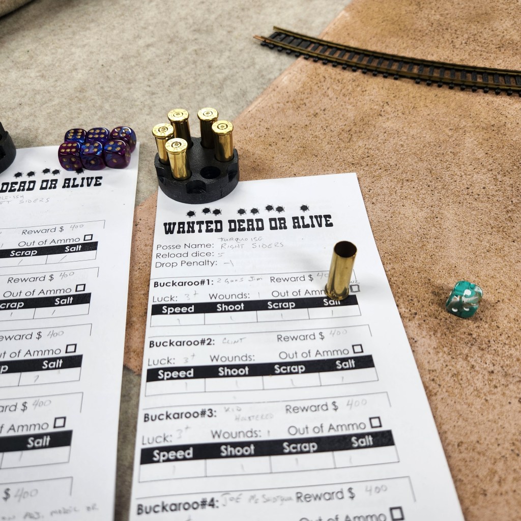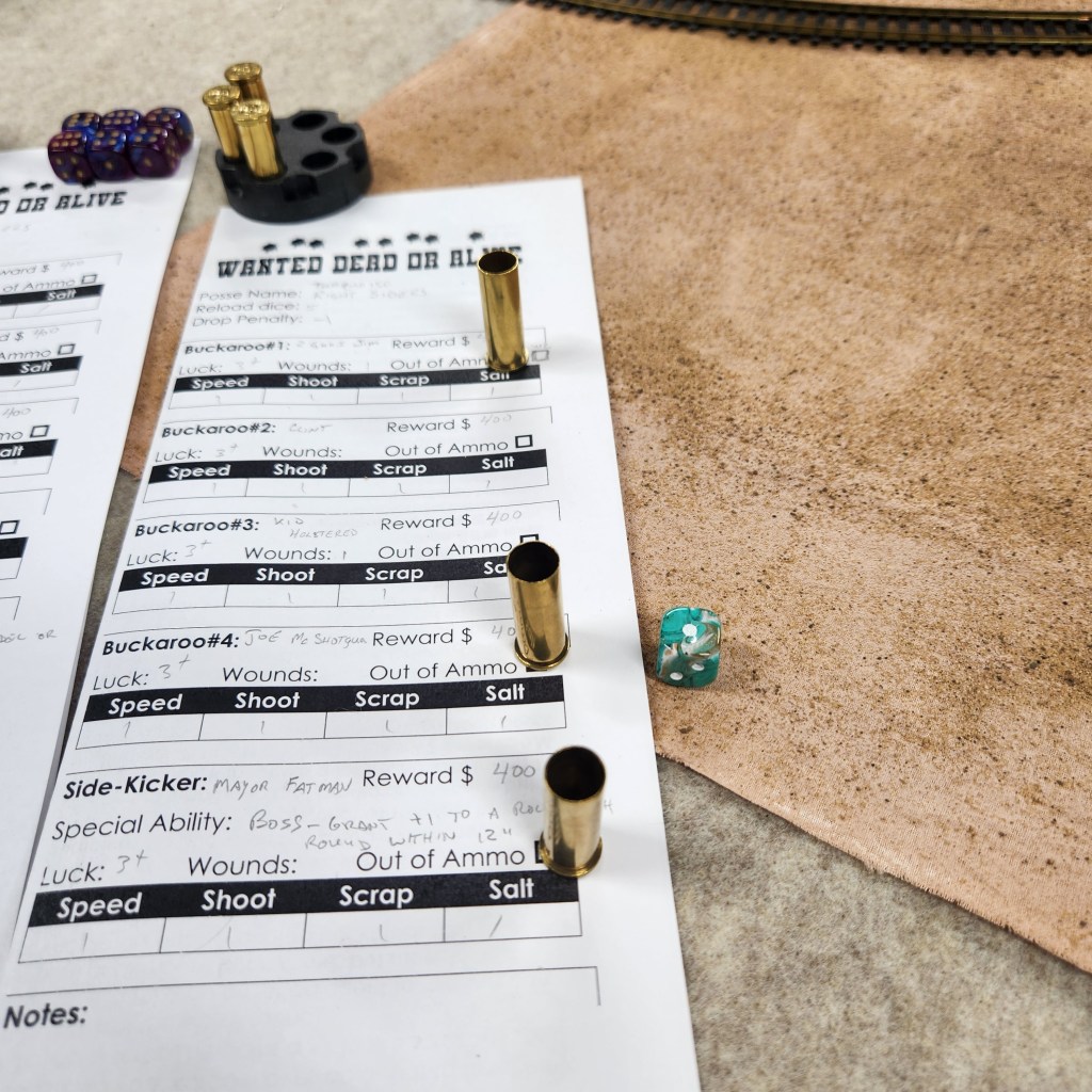 In the game each posse has a hand full of buckaroos and a side-kicker (a posse member with a special ability). Each posse also gets a random number of Reload Dice that are used to re-roll undesirable results. I used spare dice set on each posse’s stat sheet to keep track of them. Once used for a re-roll, I set the die aside. The rules also do not have you track ammo based on the number of shots fired, but instead a figure is out of ammo on a shooting to hit roll of a “1” (high numbers are better in this game so a 1 is really bad). This might be a bit abstract to some, but you can consider that your figures are smart enough to reload as they can steal a brief moment in between the action. Instead of check the Out of Ammo box on the posse’s stat sheet, and then erasing it after re-loading, I simply used a spent casing to cover the box when needed.