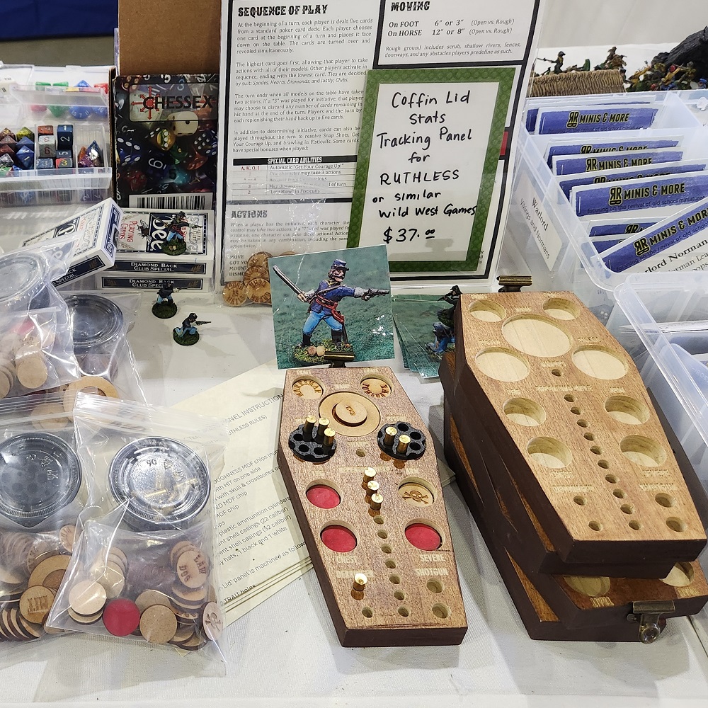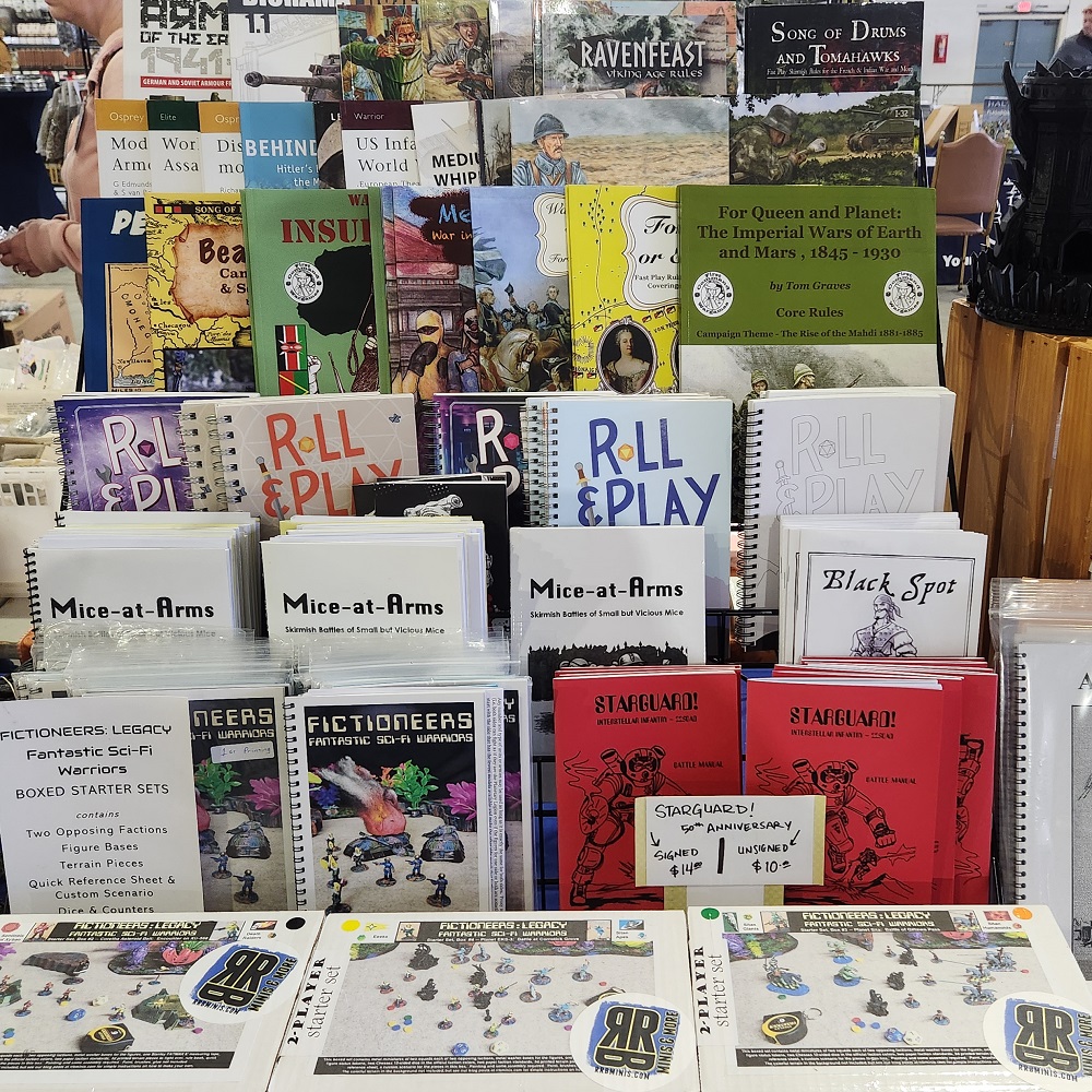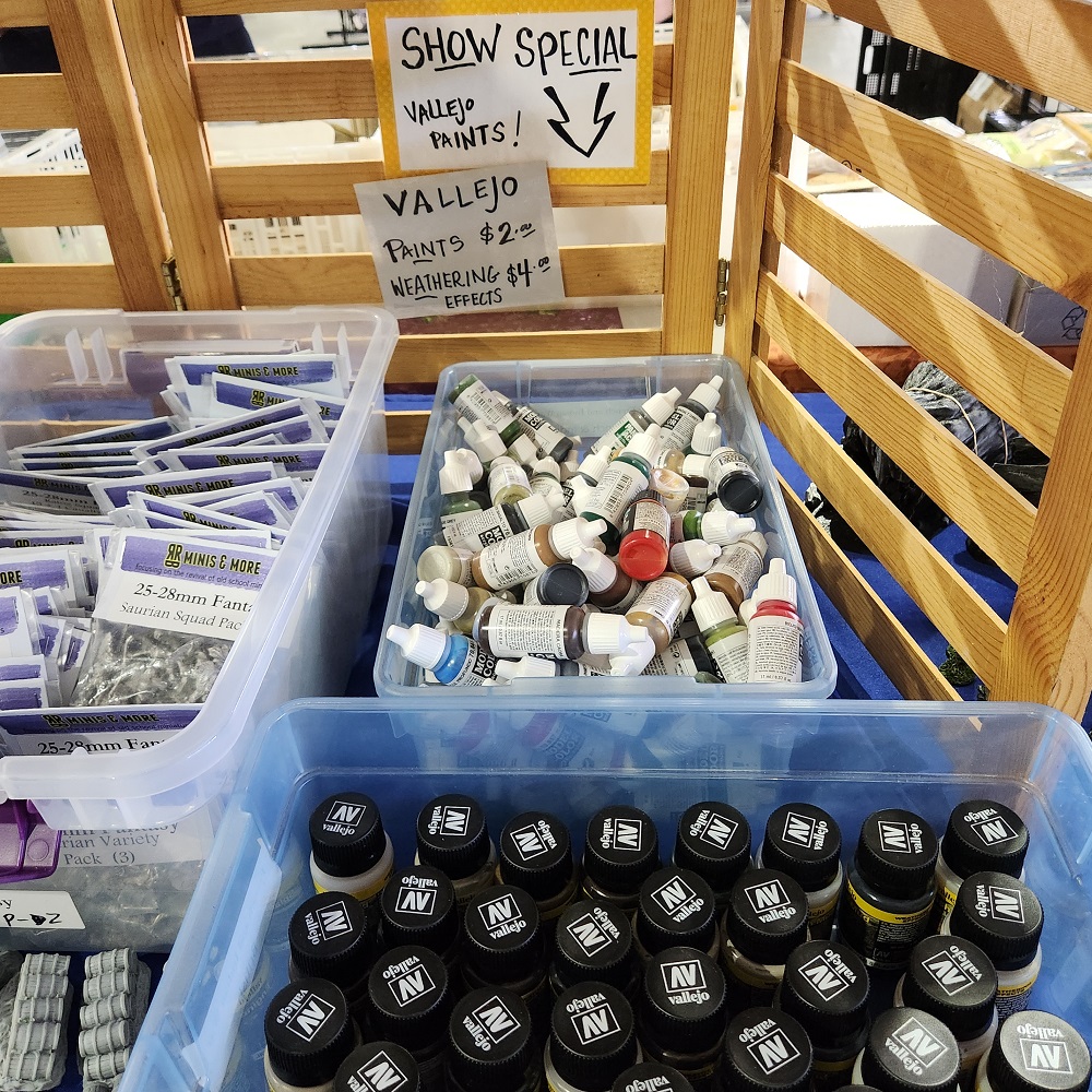 We took a sampling of our items. The standard general game supplies such as dice and measuring tapes went with us of course. We always sell a bit of those items to new gamers, or those that might have left important items at home. We also had some terrain to support the games/minis genres we carry, such as for Black Spot, a naval sailing ships game, we sold a lot of islands/sand bars/coral reefs/rocky outcroppings. We also sold some of the Coffin Lid Tracking Panels for the western game Ruthless. I had a good time talking to one of the Little Wars TV guys about them briefly while he was in the booth shopping. We also had our standard array of rules and Osprey books, boxed army/game sets, dice towers, and fantasy terrain of course. Those all sold pretty well. And we had something that I don’t normally take to shows: Vallejo paints. I’m scaling back the number of these that will be carried in the shop. Vallejo unfortunately, does not want to deal with me directly, and the distributor’s price to me is more than Amazon’s price to everyone. I am tired of people telling me that they can buy it cheaper on Amazon. “No joke… so can I.” I was selling these at my cost just to support our customers, but the inventory control is becoming too burdensome. Anyway, these excess bottles got marked down well below my cost: $2 per 17ml bottle of paint or primer, and $4 per 40ml of Weathering Effects. Not even Amazon will sell them to you at that price. We sold quite a few. I’ll keep taking them to shows and have them available to in person shoppers until they are gone. The regular inventory will be maintained for online shoppers at least until the end of the year (longer if I find a cheaper distributor).
