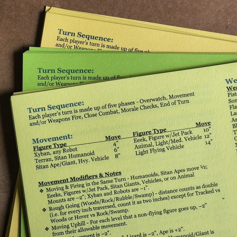 The Quick Reference Sheet (QRS) is here. (All currently known Errata has already been corrected here also.) Based on feedback from players, this was formatted to be in a booklet layout. It is still essentially just 2 sides of one 8.5×11 in. page, but now it is intended to be folded in half and flipped though booklet style. And also based on player feedback, we added page numbers as an aid to direct new players’ attention to specific areas.