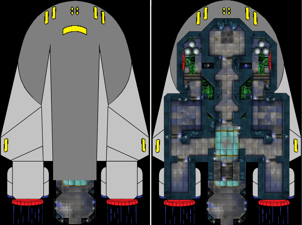 Scenario 11: A huge thank you to Loresmyth for allowing us to use their map tile set to build the ship floor plan and offer it to you for your personal use. We have it in three ways. 1. Full for those that want to have it printed as one sheet as a 30″x48″ poster. 2. Printed out for you on a sturdy 30″x48″ vinyl mat. 3. Divided for those wanting to print it on standard U.S. 8.5×11 in. sheets of paper. If you need something else, let us know. If using the sheets of printer paper method, the sheets can be trimmed and taped together to make a full-size game map ready for miniatures. Or a better method is to pick up 11 12×12 in. vinyl self-adhesive floor tiles. Stick a sheet to each one and then trim with a good metal straight edge. These tiles have enough weight to say in place during gaming and will last a long time for repeated use. A smaller version of the ship (to aid in tile arrangement), an image of a printed sheet with minis on it as an example, and the specific tile set used to make this floor plan map (called Nebulus Outpost) are all shown below. The tile set is available as a download at Drive Thru RPG. While you are there, use their search function (simply type in Loresmyth) to find their many other great other sets. I have most of them and love them all. Also, check out all Loresmyth’s amazing physical game products on their site here. Not a paid endorsement. I purchased all the items myself. As always, I simply recommend items that I have personally used and believe are good products and values.