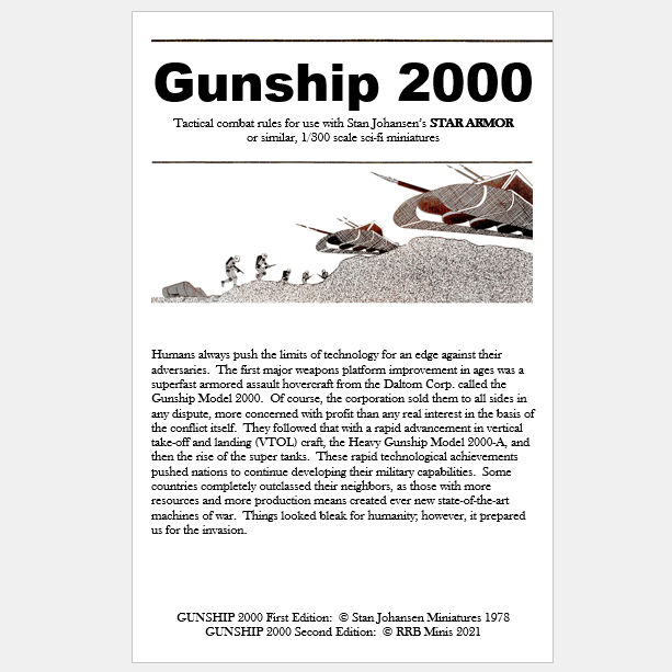 The other item we added as a bit of back story about the rules name “Gunship 2000”. It was not mentioned in the original rules at all, but likely it referred to the year 2000 which back then, seemed like a long ways away… surely we’d have flying cars and whatnot by then, right? With the benefit of hindsight, we knew that would not fly today. The rules put the combat hovercraft right up on the cover in a place of prominence, so we felt it must be important. We decided to run with that and so we introduced the Daltom Corp. combat hovercraft called the Gunship Model 2000. This piece of equipment was so pivotal to the way warfare was conducted, that it earned a spot in the cover art, rules name, and in our mini packs. By that, we are referring to the core set pack will cover early (sci-fi) Earth wars up to the development of the combat hovercraft gunships. Our 1st expansion pack will cover the larger tanks, long range missile launches, etc. that all came later. Then our 2nd expansion pack will cover the alien invasion of Earth, and the rise of the Mechs. This will allow gamers to step into it a little at a time.