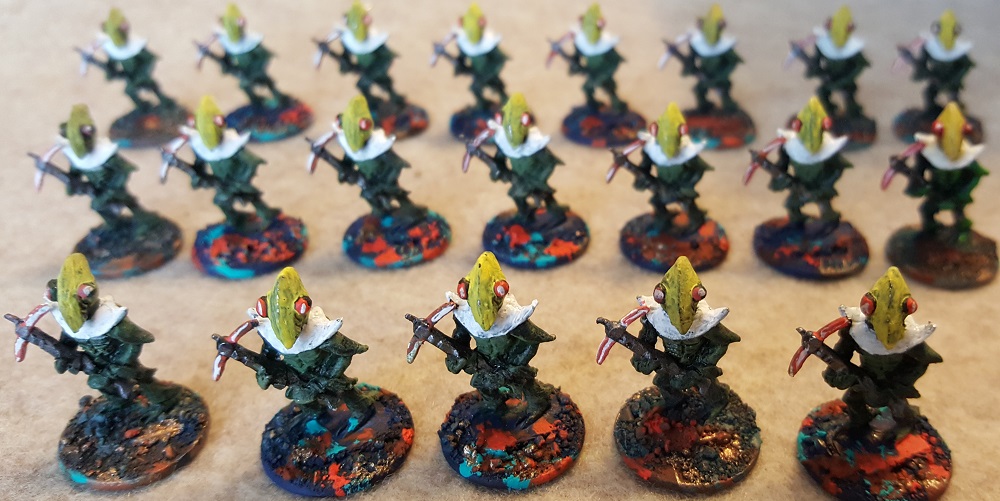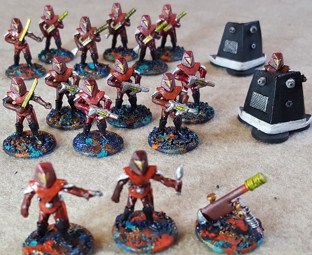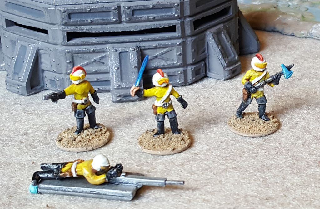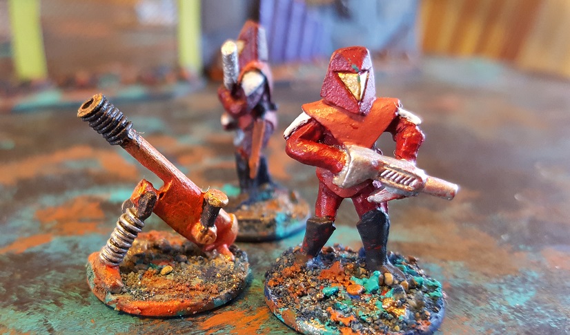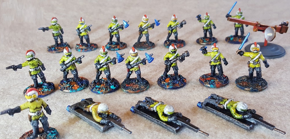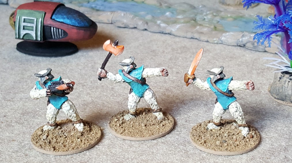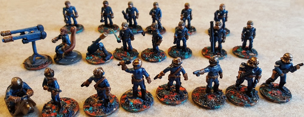These are 25mm sci-fi figures that were sculpted by Stan Johansen in the ’70s. They are true 25s: A 6′ individual is represented by a mini that is 25mm from foot to top of the head. That makes them 1/72 scale; however, metal figures tend to have a much stocky build than plastic minis so keep that in mind if you intend to mix them. These are a perfect size to mount on 3/4″ diameter washers and use for games with 1″ squares or hexes.