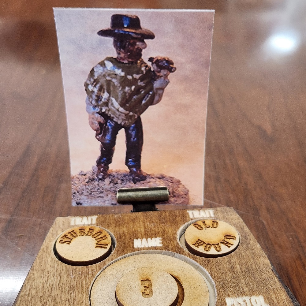 We also have these super cool character stat trackers. Don’t look like a green horn; play in style with one of these! Include tokens for all the available traits, wounds, and game situations, plus empty casings to track ammo. It even has a convenient spring clip to hold a image of the boards character to help keep the individual panels matched up to the correct figures. A boxed starter set is in the works.
